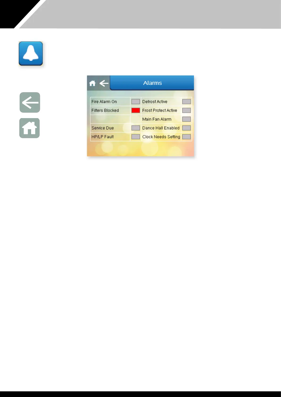 The Alarms screen displays warnings or faults wi e Variheat, indicated by a