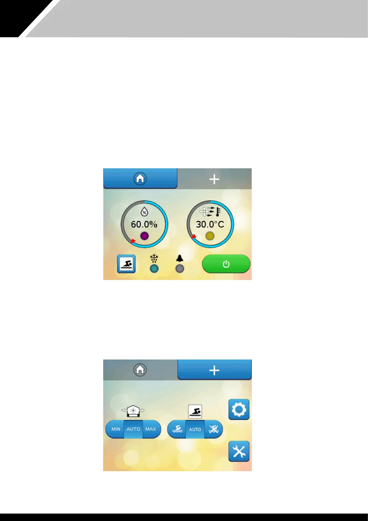 These two screens display current operating conditions and main controls. Functions on e home screens can be modified if allowed by e User Security Mode