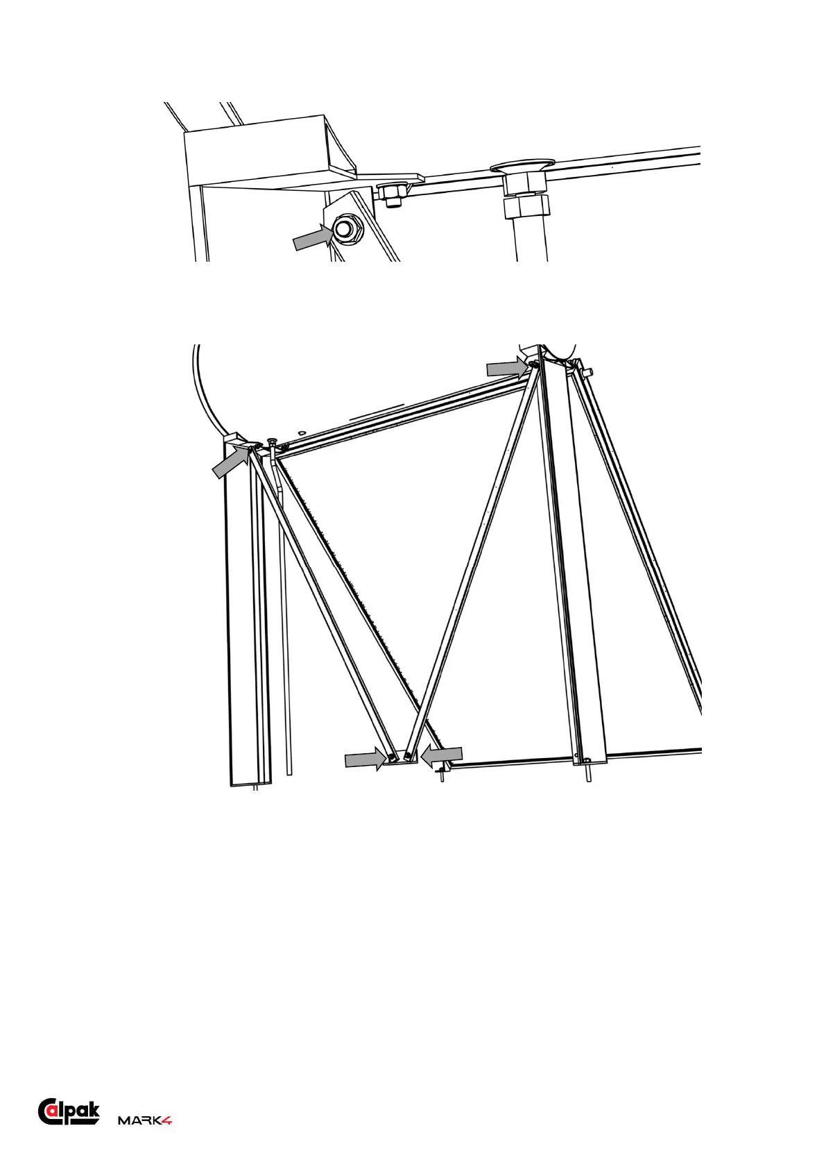 Connect the brace system with the pillars. Do not tighten the bolts, ensure however that they are not