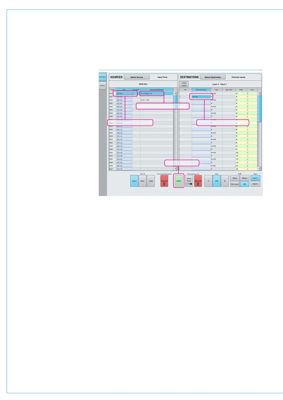 FIG 3 - PATCHING HYDRA2 INPUT PORTS TO INPUT CHANNEL PATHS ON FADERS