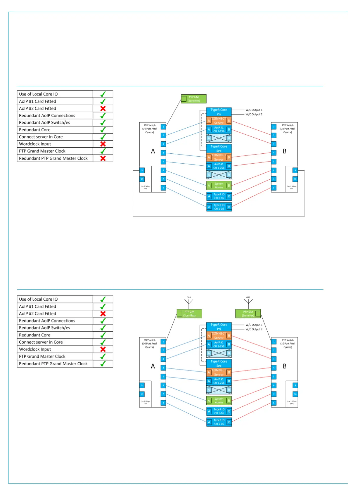 EXAMPLE 9: REDUNDANT CORE WITH LOCAL I/O + 2 AOIP BOXES ON 2 REDUNDANT PTP SWITCHES + REDUNDANT PTP