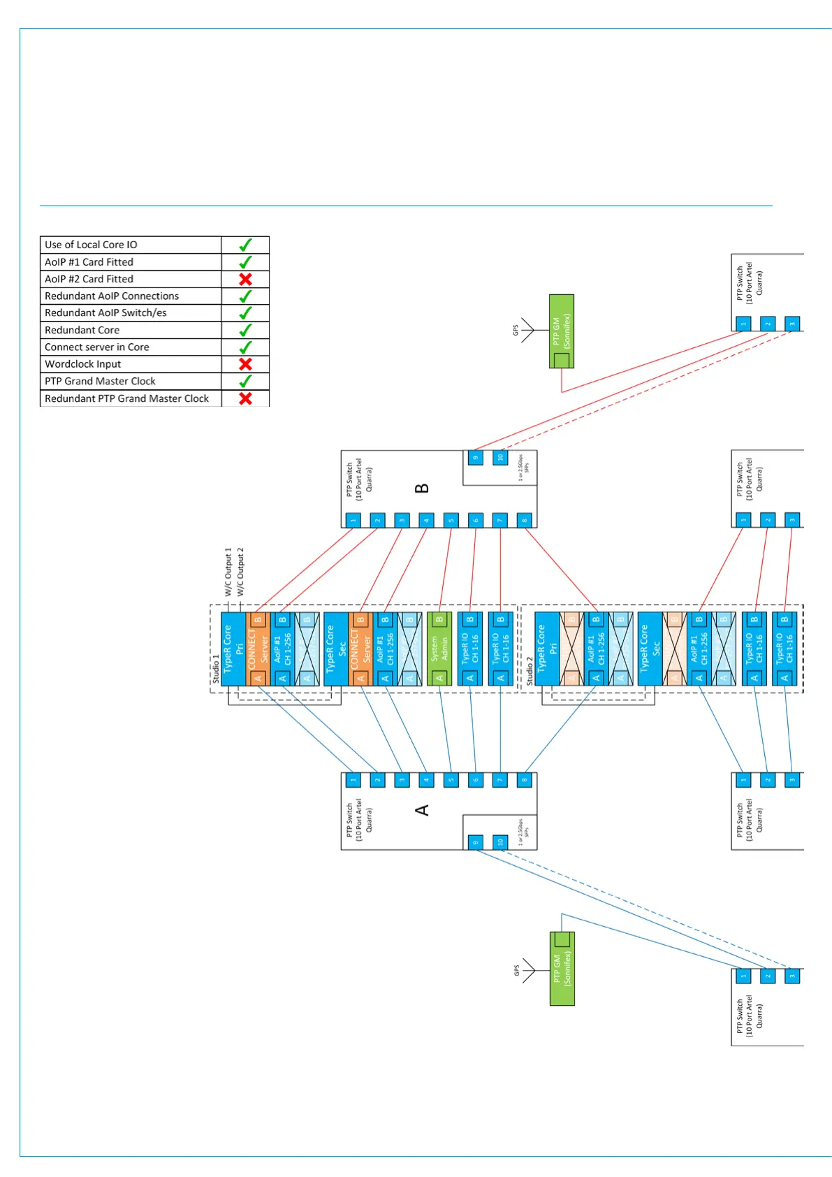 EXAMPLE 11: 4 STUDIOS REDUNDANT CORES WITH LOCAL I/O + 8 AOIP BOXES ON 8 REDUNDANT PTP SWITCHES