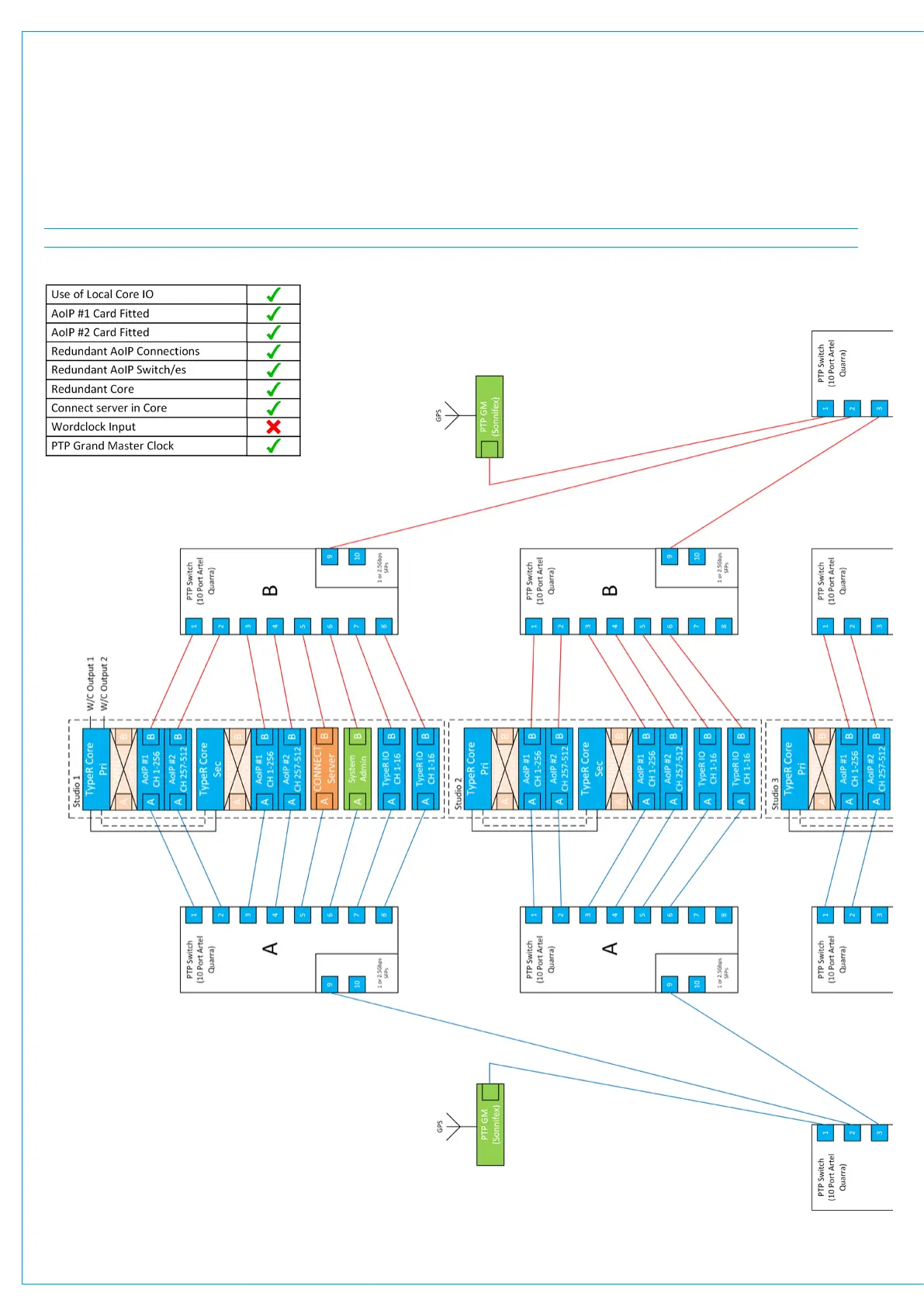 EXAMPLE 13: 4 STUDIOS + MCR, REDUNDANT CORES (2 AOIP CARDS/CORE) WITH LOCAL I/O + 32 AOIP I/O BOXES
