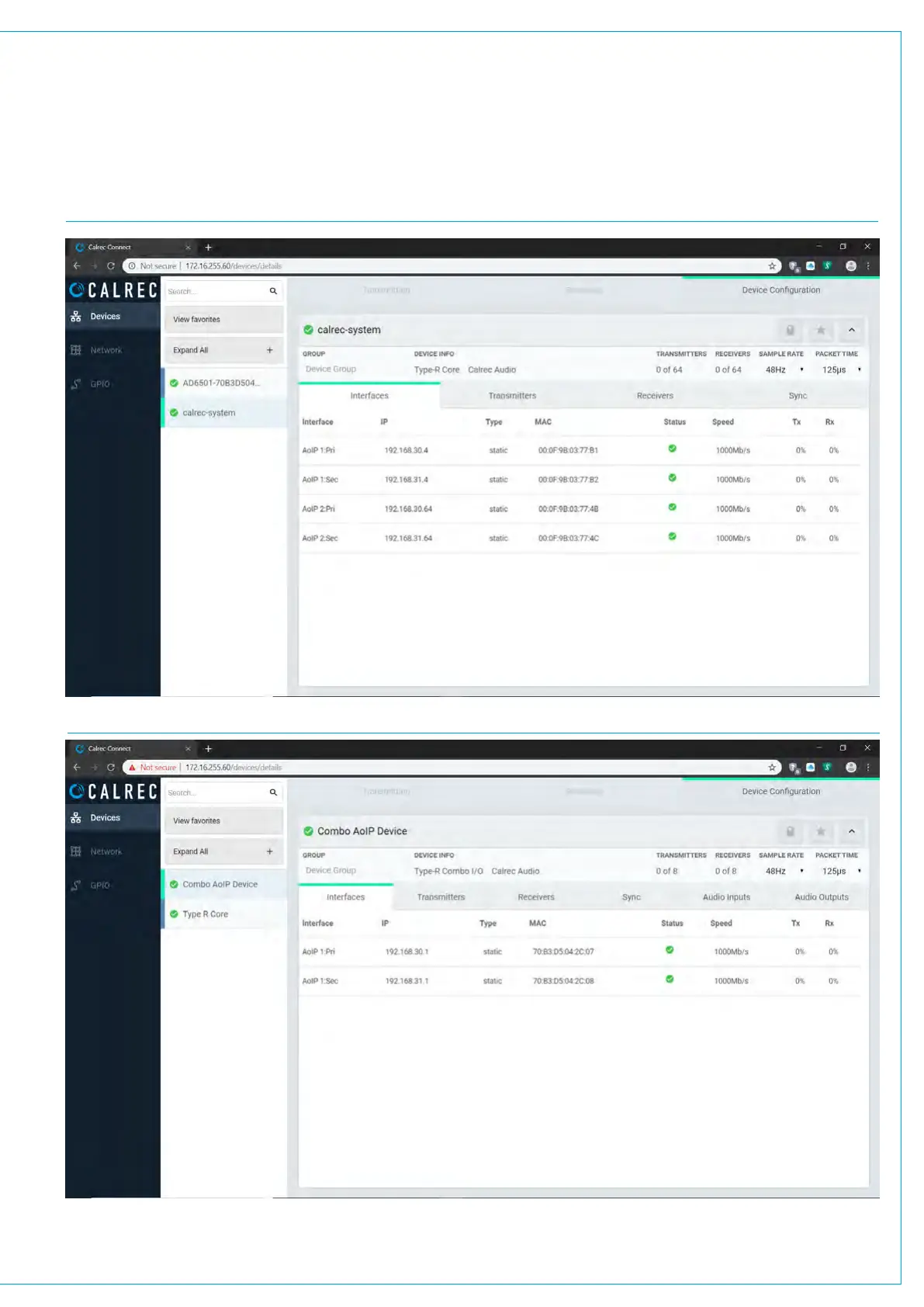 CALREC CONNECT SHOWING THE TYPE R CORE AOIP PORTS READY FOR CREATING TRANSMIT AND RECEIVE STREAMS