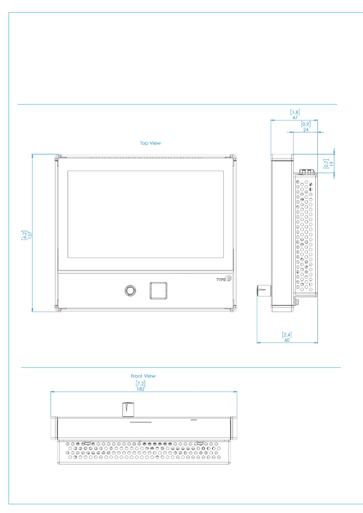 The following diagrams show the surface measurements of the MU6410 Small Soft Panel all in millimetres (mm) & inches [in].