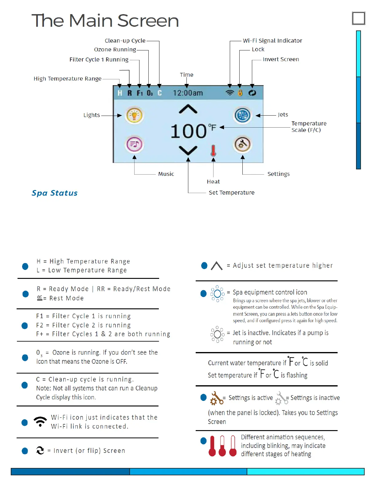 Important information can be found on the main screen, such as temperature adjustment, current spa
