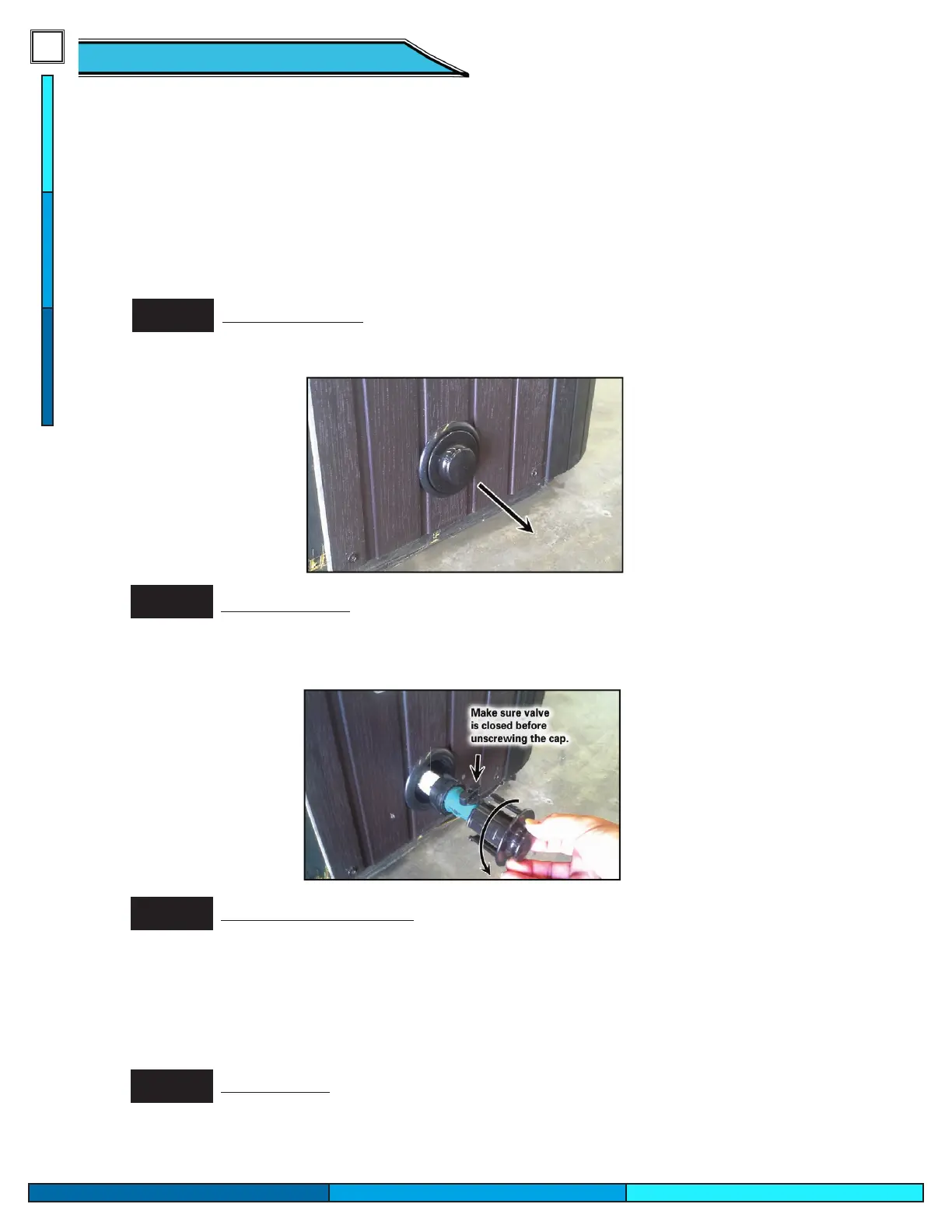 Turn the valve on the hose-bib xture to open the drain. When the spa has drained completely, turn