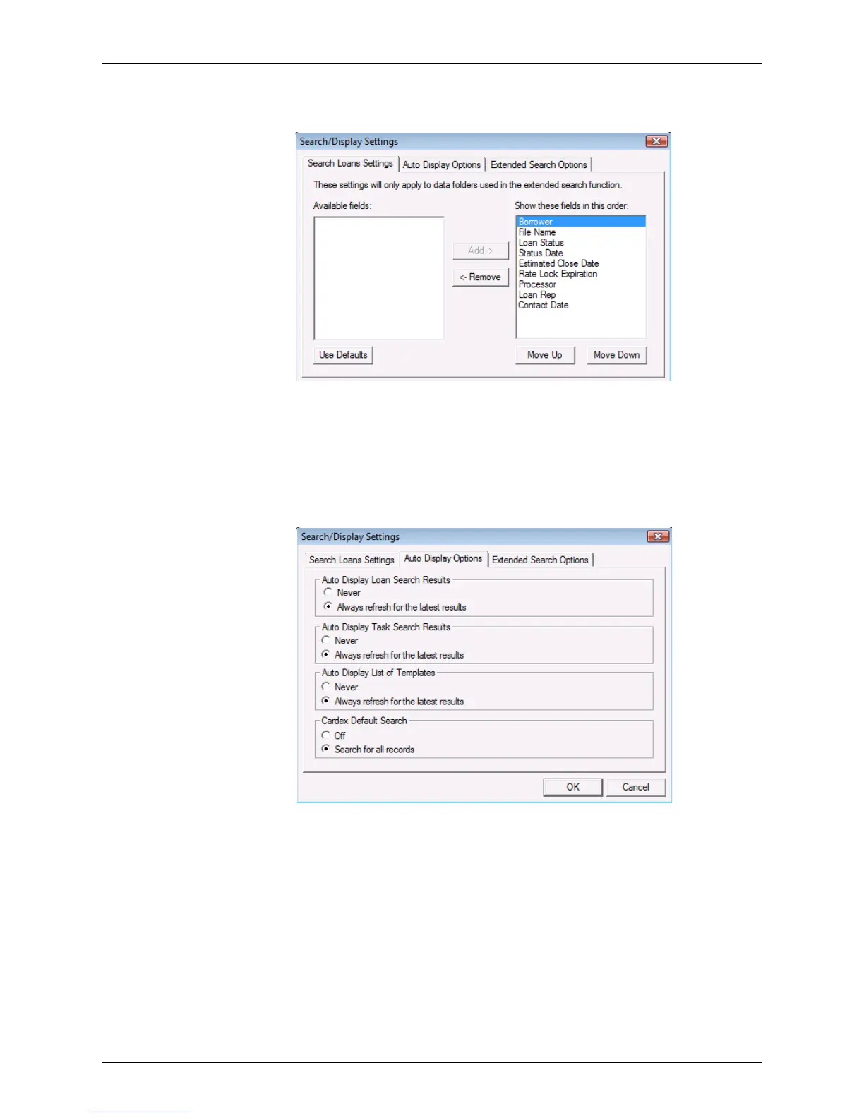 The Search/Display Settings dialog box is displayed with the Search Loan Settings