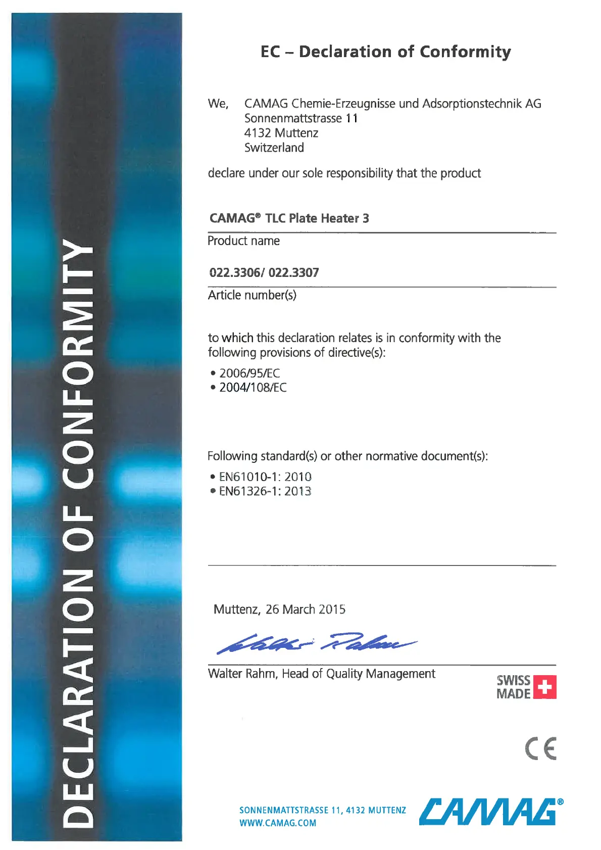 CAMAG TLC 3 - EC - Declaration of Conformity