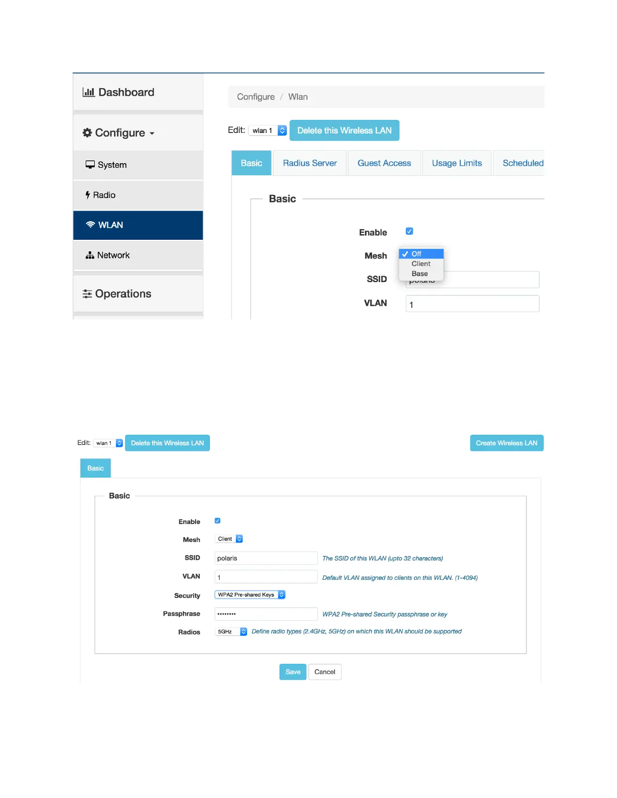 Once either of the two mesh options is selected, the rest of the WLAN configuration