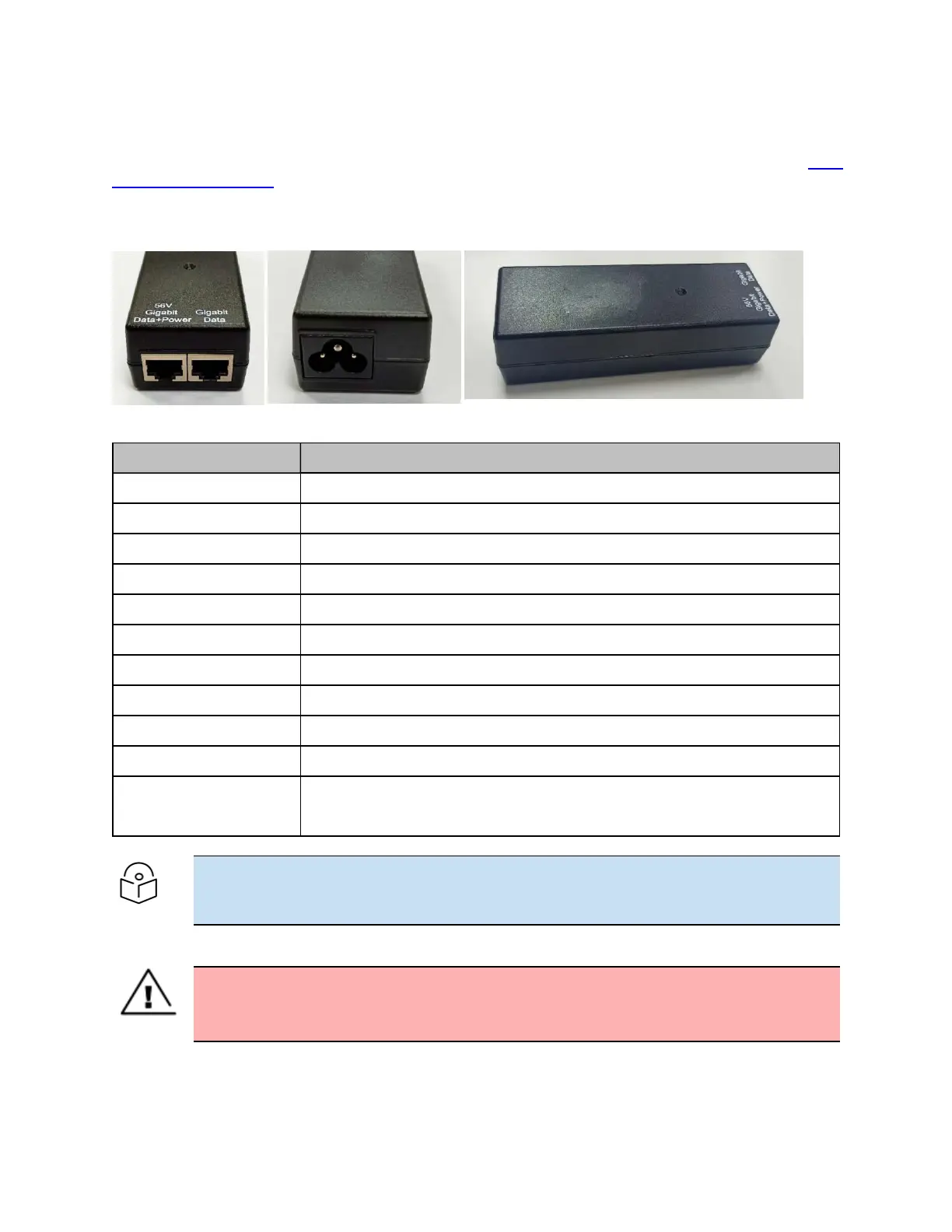 Table 17: PoE, 15W 56V, 1 Gigabit DC injector (N000900L017A)
