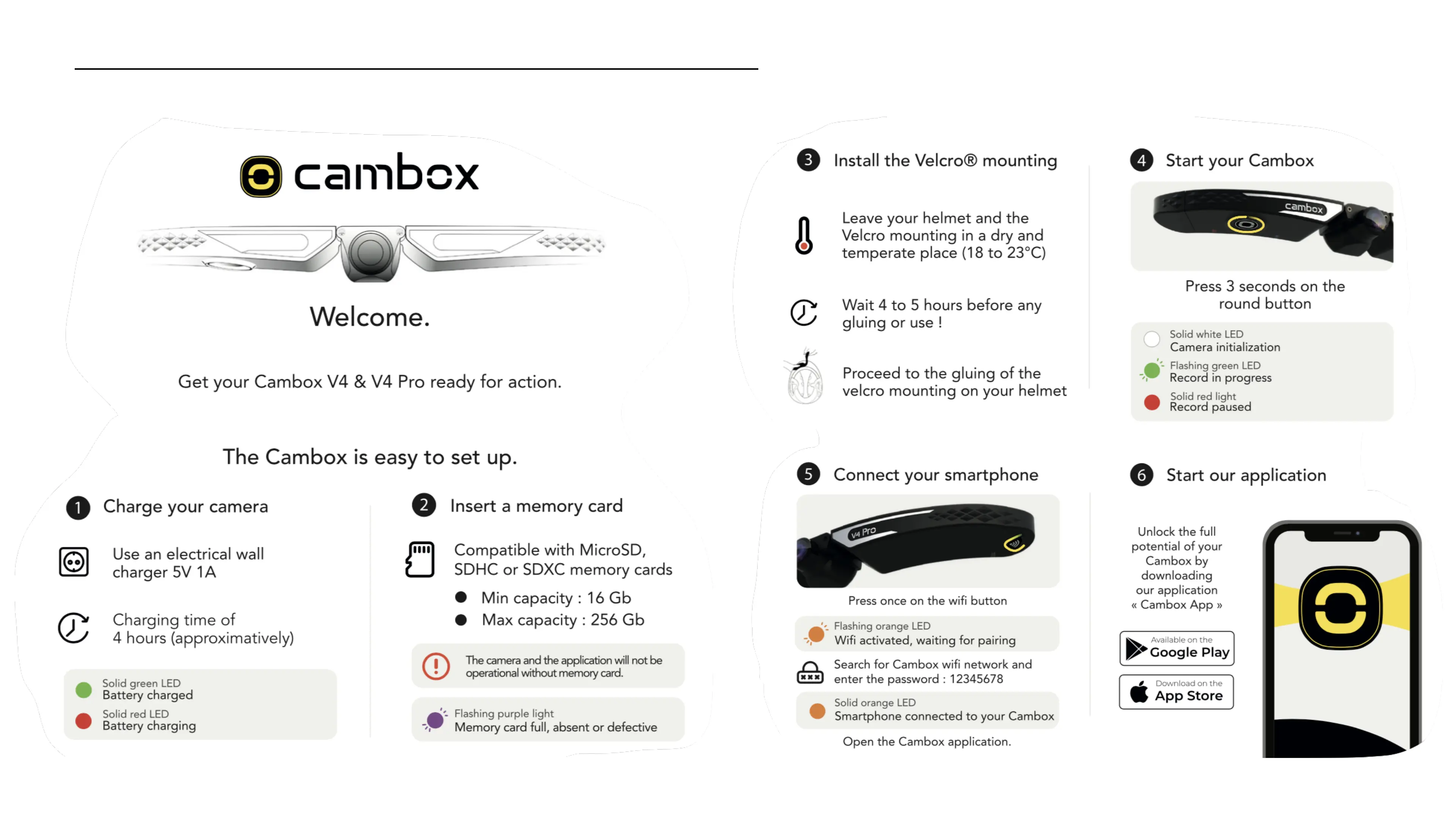 CAMBOX V4 - Quickstart Guide; Initial Setup: Charging and Memory Card; Mounting, Powering On, and App Connection