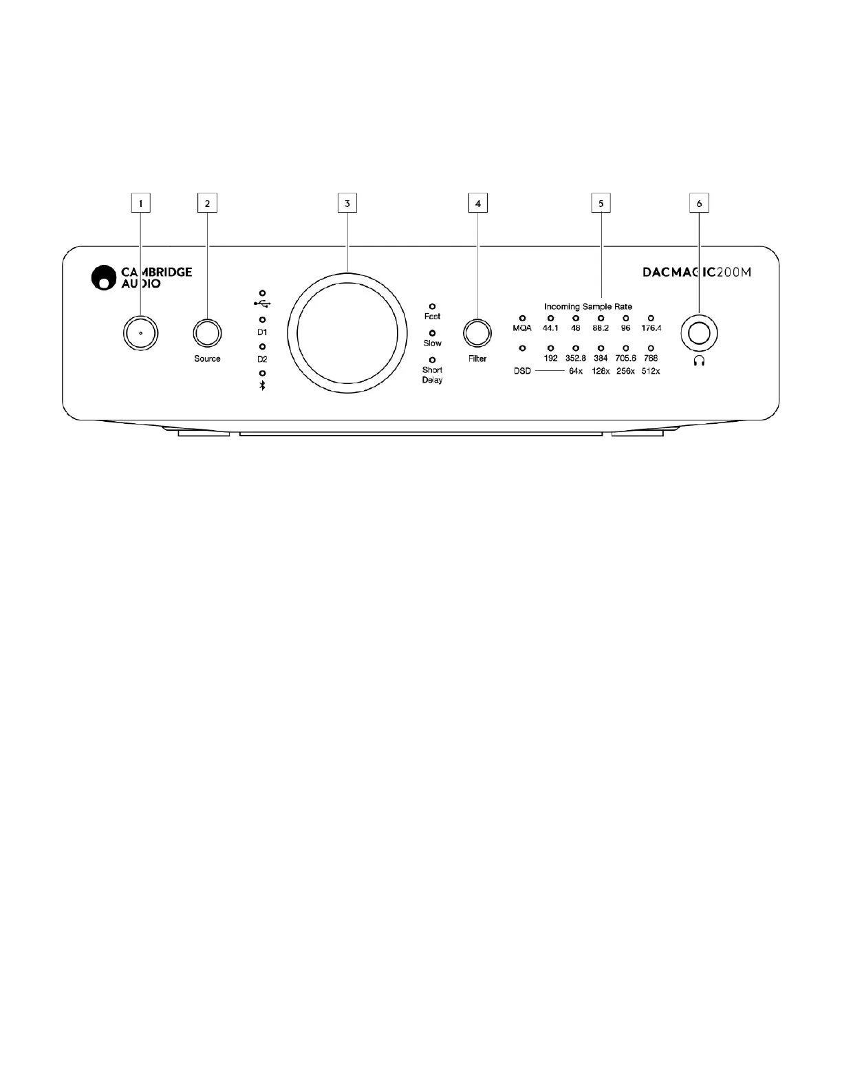 5. Incoming Sample Rate – When the DacMagic 200M is receiving an incoming digital stream, the relevant LED will light up to indicate the incoming