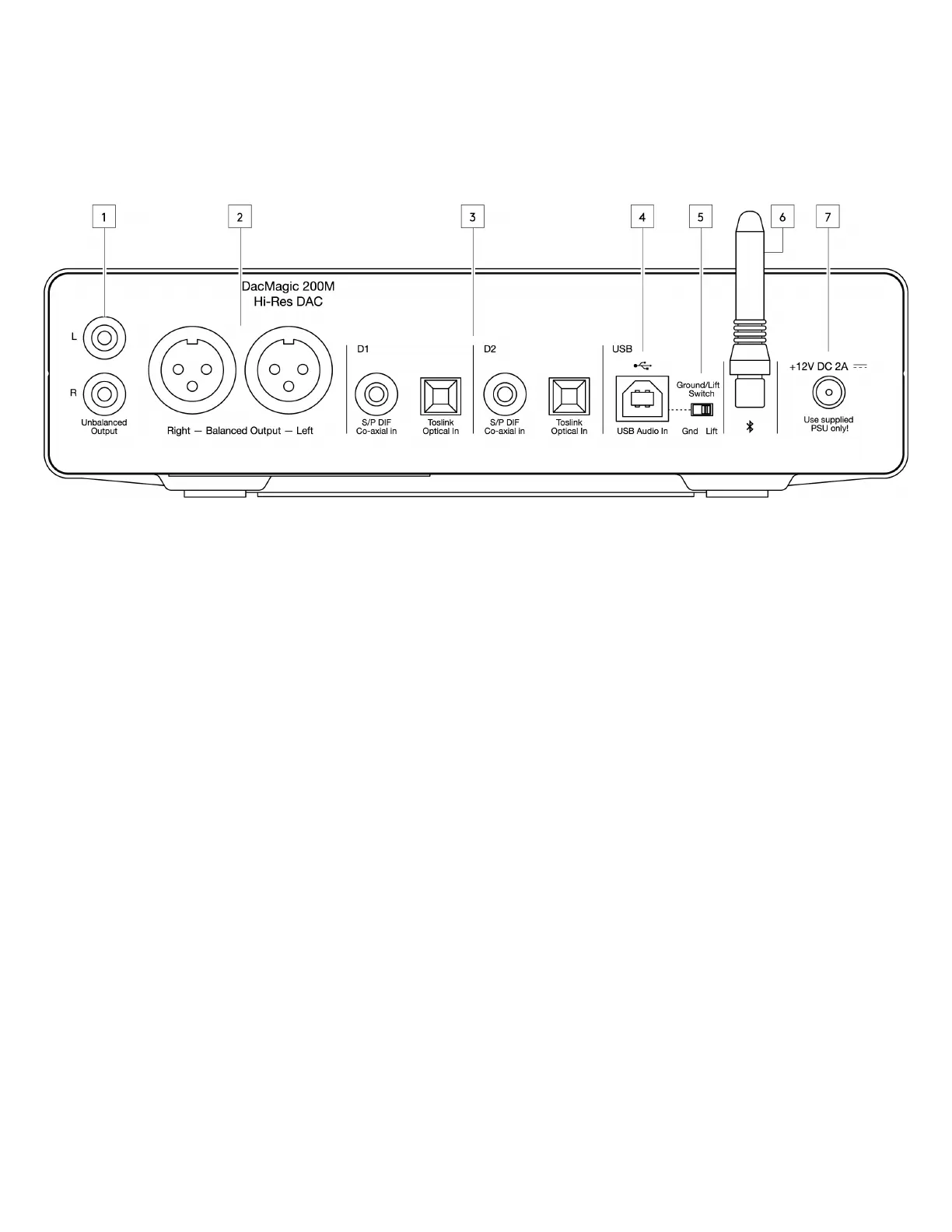 7. DC 12V 2.0A Power Adaptor Socket – Note: Only use the power supply included with the DacMagic 200M.