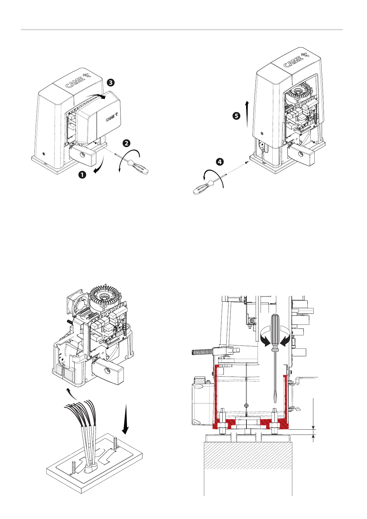 Caution! The electric cables must pass under the gearmotor casing and must not touch any parts that may overheat during use, such as the motor