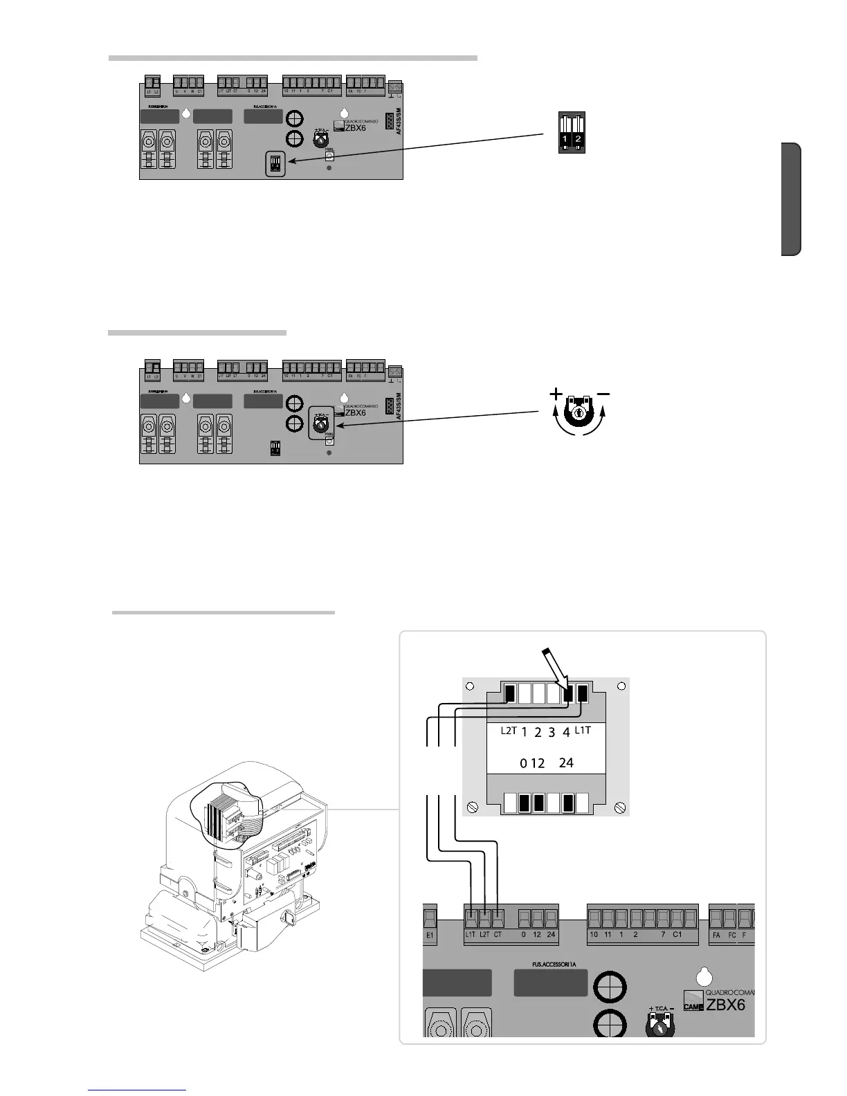 Trimmer T.C.A. = Automatic closing time. Adjusts opening waiting time; Once the time is elapsed, a closing run is automatically activated.