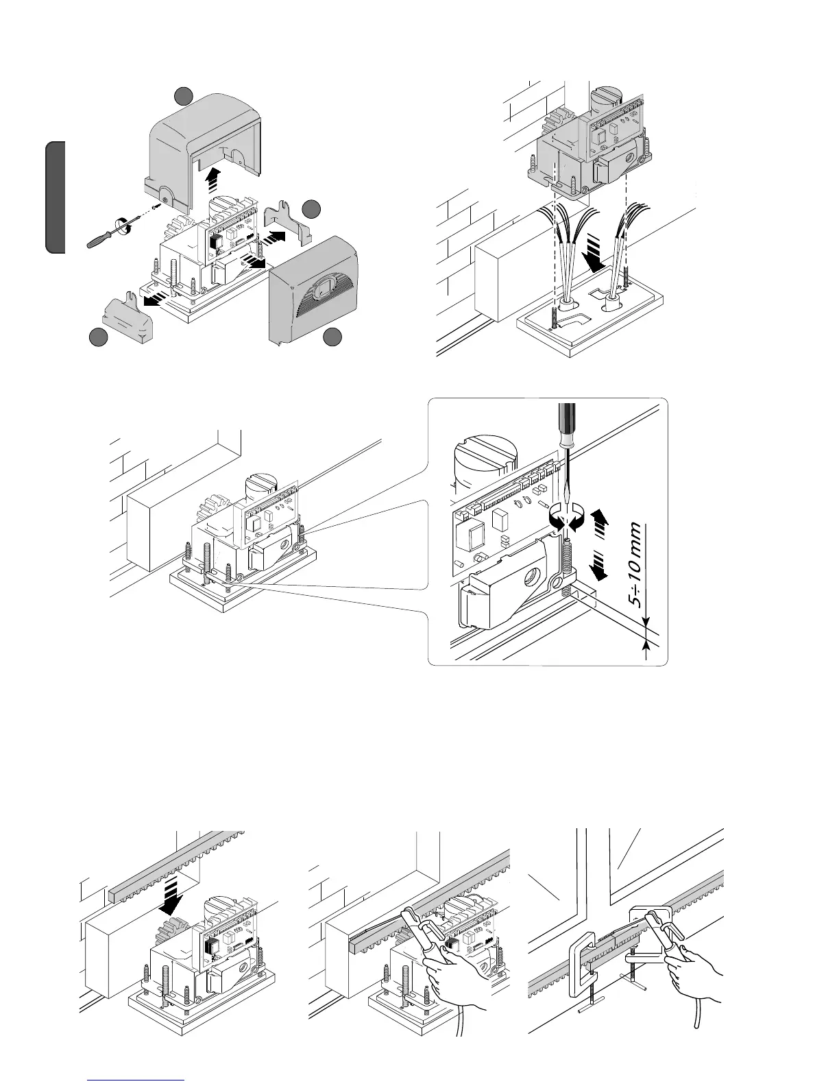 - Remove the cover of the gearmotor by turning the laterl screws. Position the gearmotor onto the plate. Warning!The electrical cables