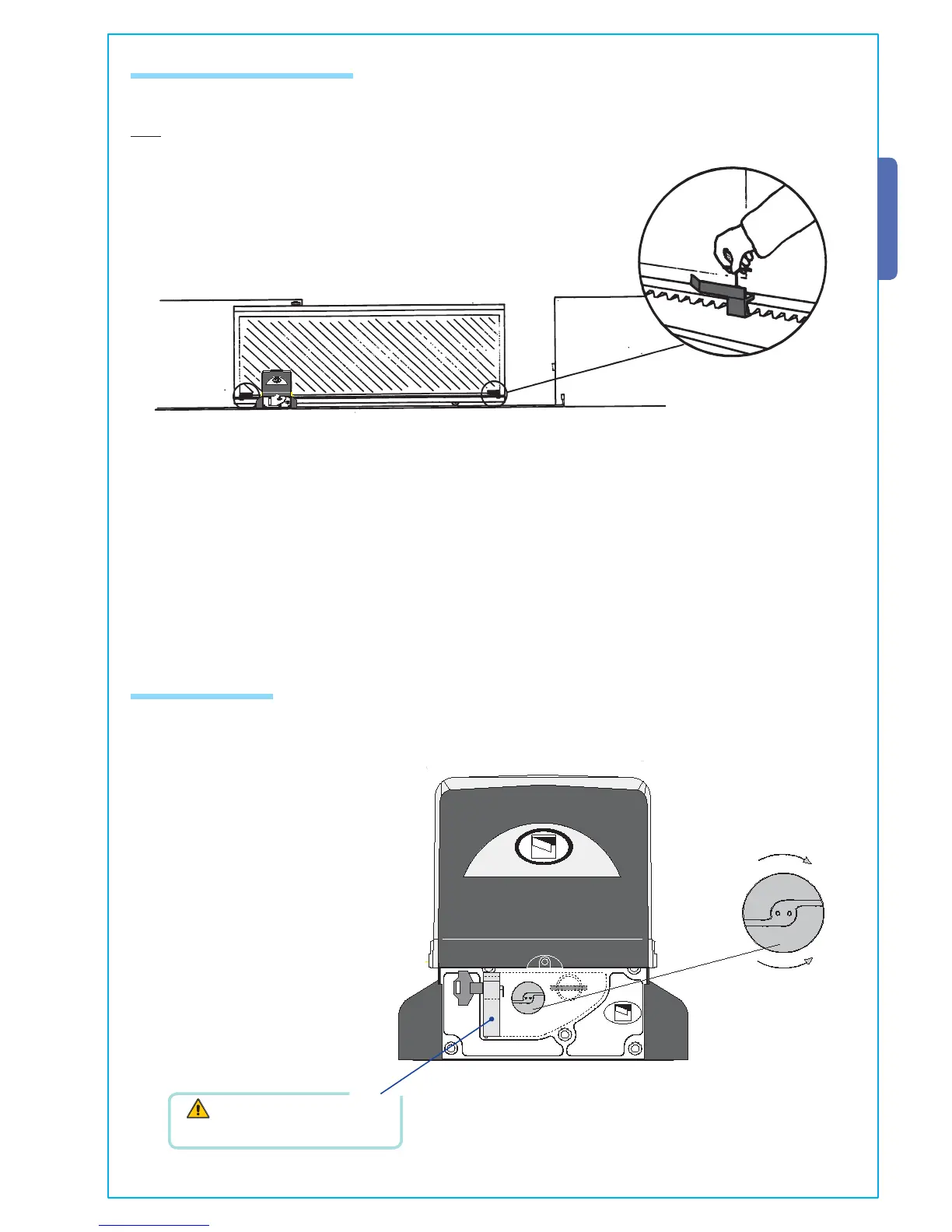 Position the limit-switch tabs (whose positions determine the limits of gate travel) on the rack.
