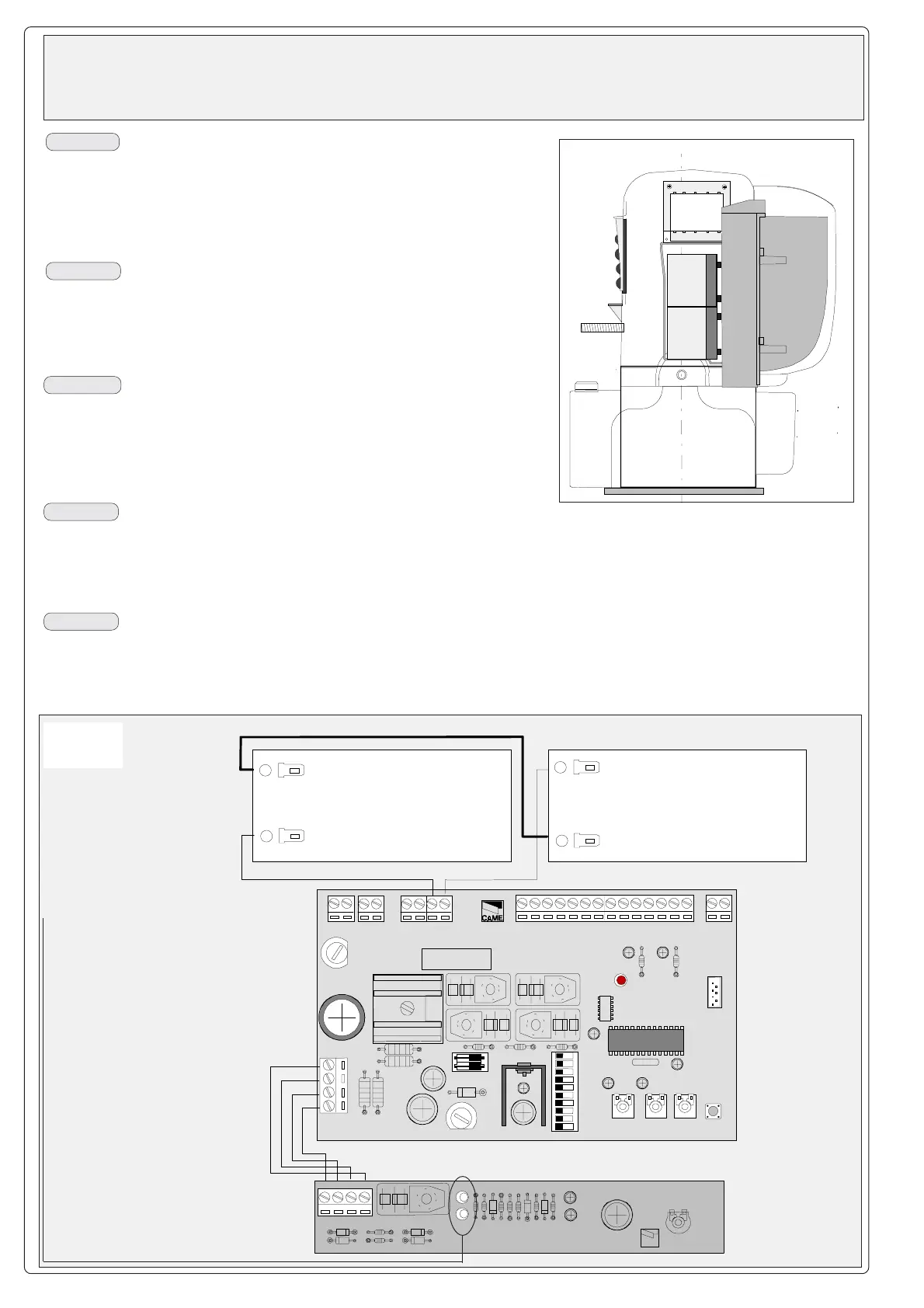 - Introducir las baterías en la patilla presente a tal efecto y conectarlas (utilizando los hilos suministrados) al borne (+,-) de la