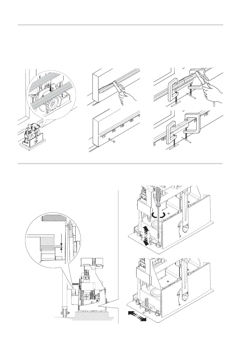 Manually open and close the gate and adjust the pinion-rack coupling distance using the threaded feet (vertical