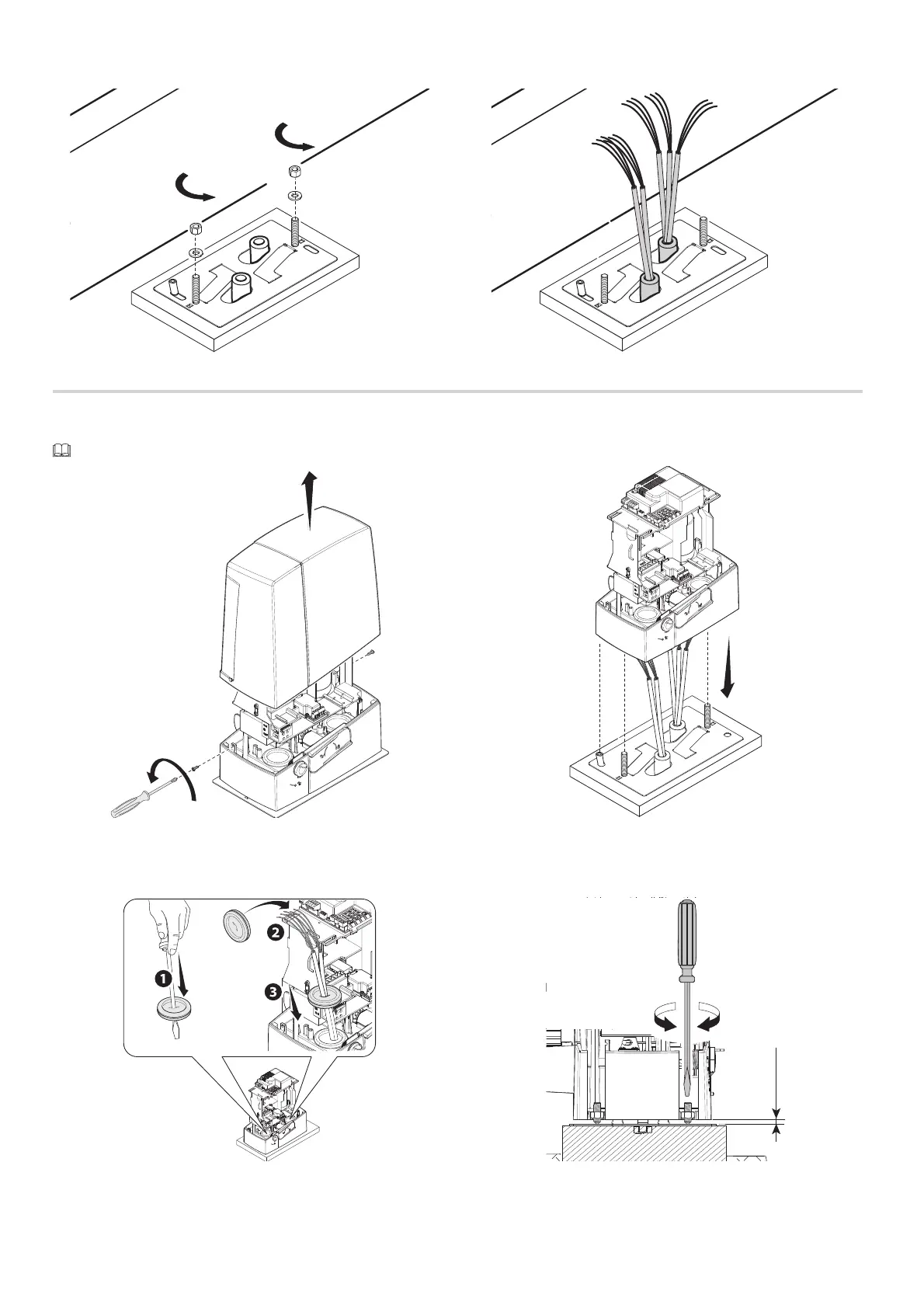 Lift the operator by 5-10 mm from the plate by adjusting the threaded feet, to allow for any adjustments that may need to be made between the rack and pinion.