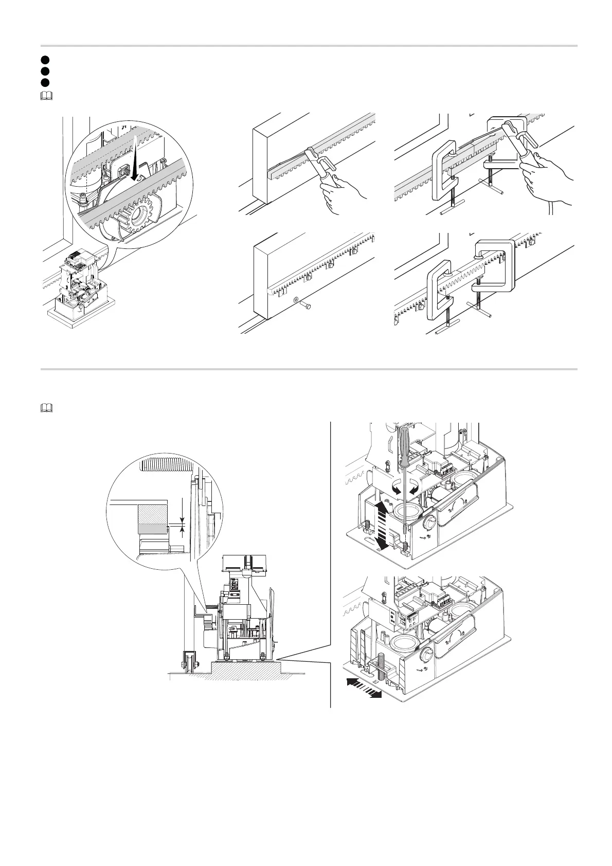 Adjust the pinion-rack coupling distance using the threaded feet (vertical adjustment) and the holes (horizontal adjustment).