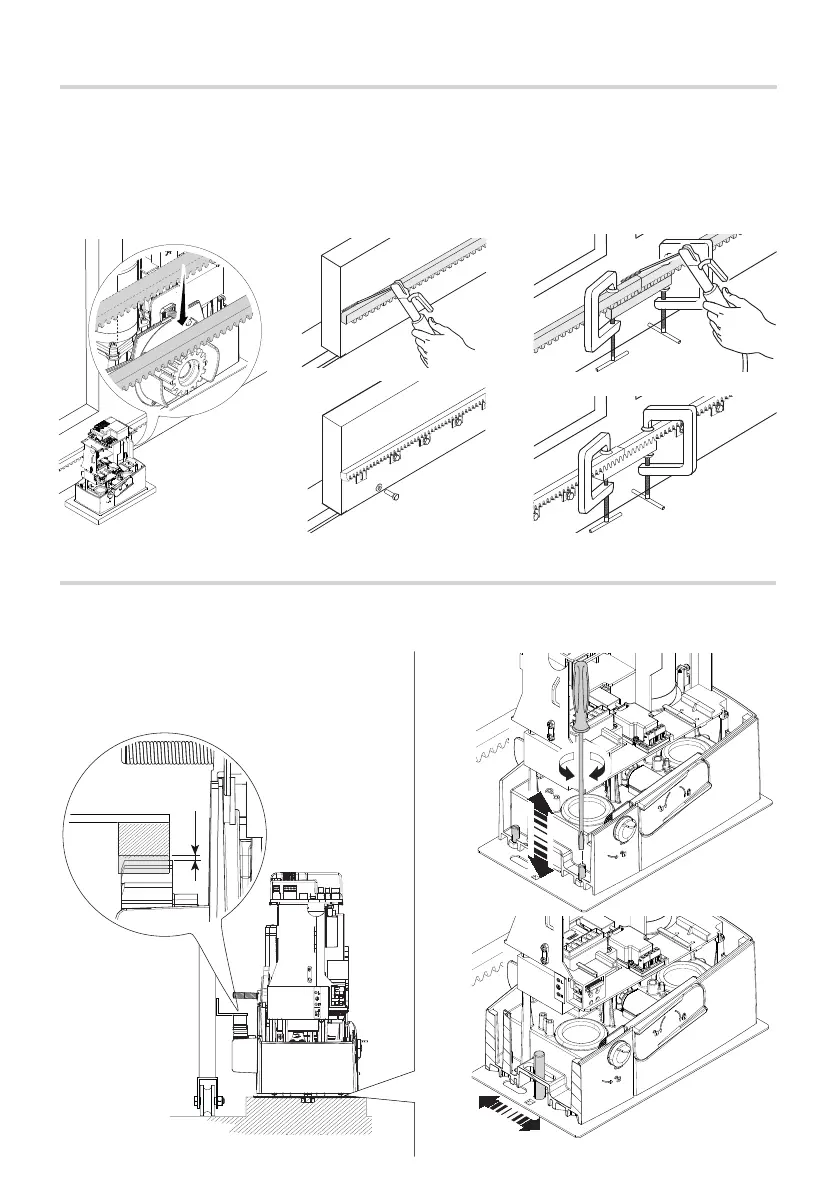 Manually open and close the gate and adjust the pinion-rack coupling distance using the threaded feet (vertical