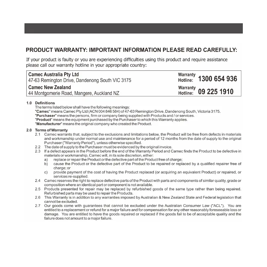 Camec 050122 - Warranty; Important Information and Contact Details; Terms of Warranty