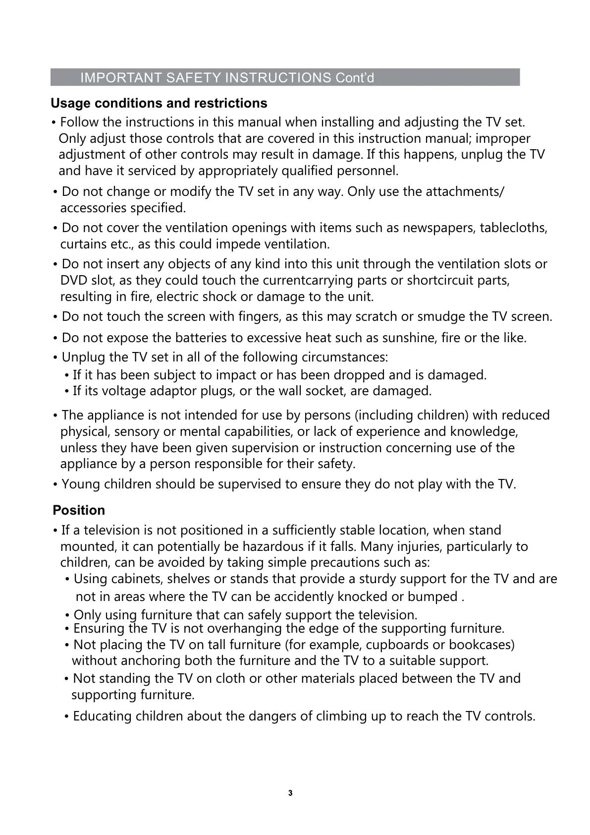 • Educating children about the dangers of climbing up to reach the TV controls.