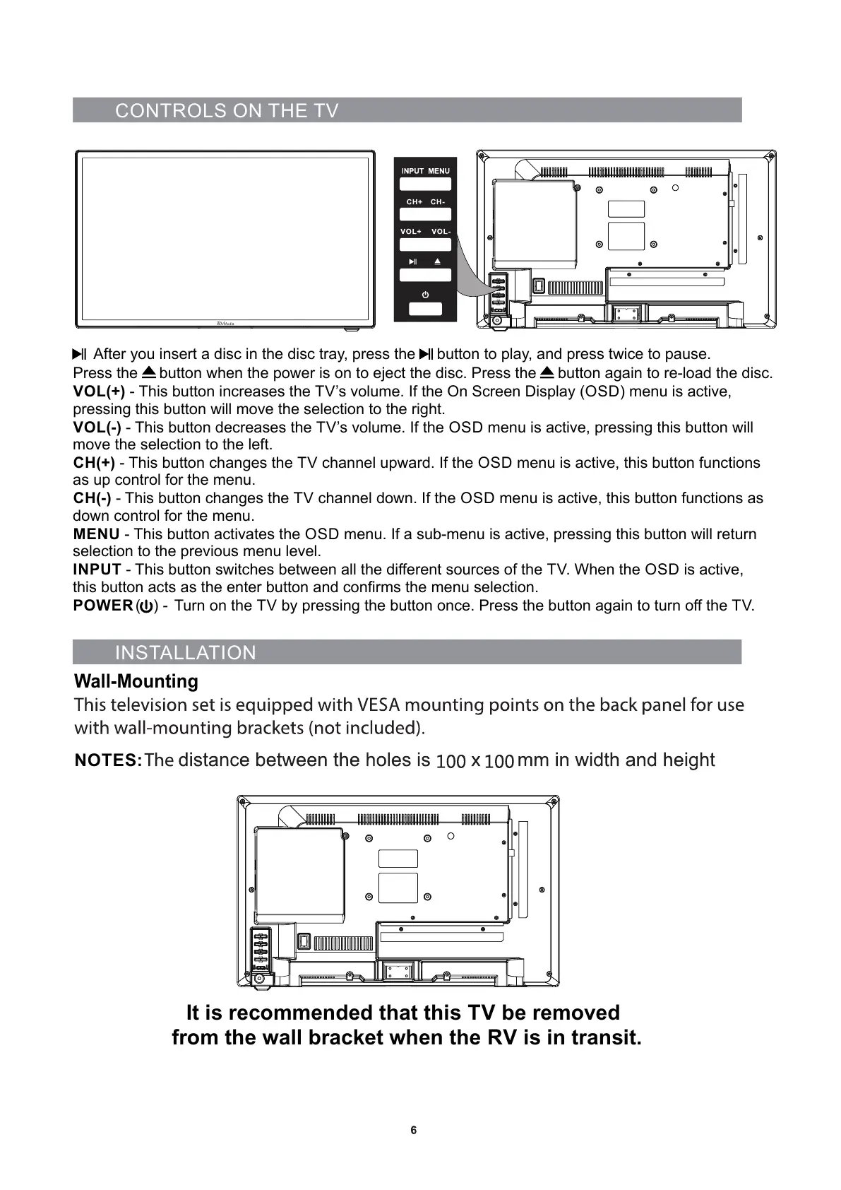 ( ) - Turn on the TV by pressing the button once. Press the button again to turn off the TV.
