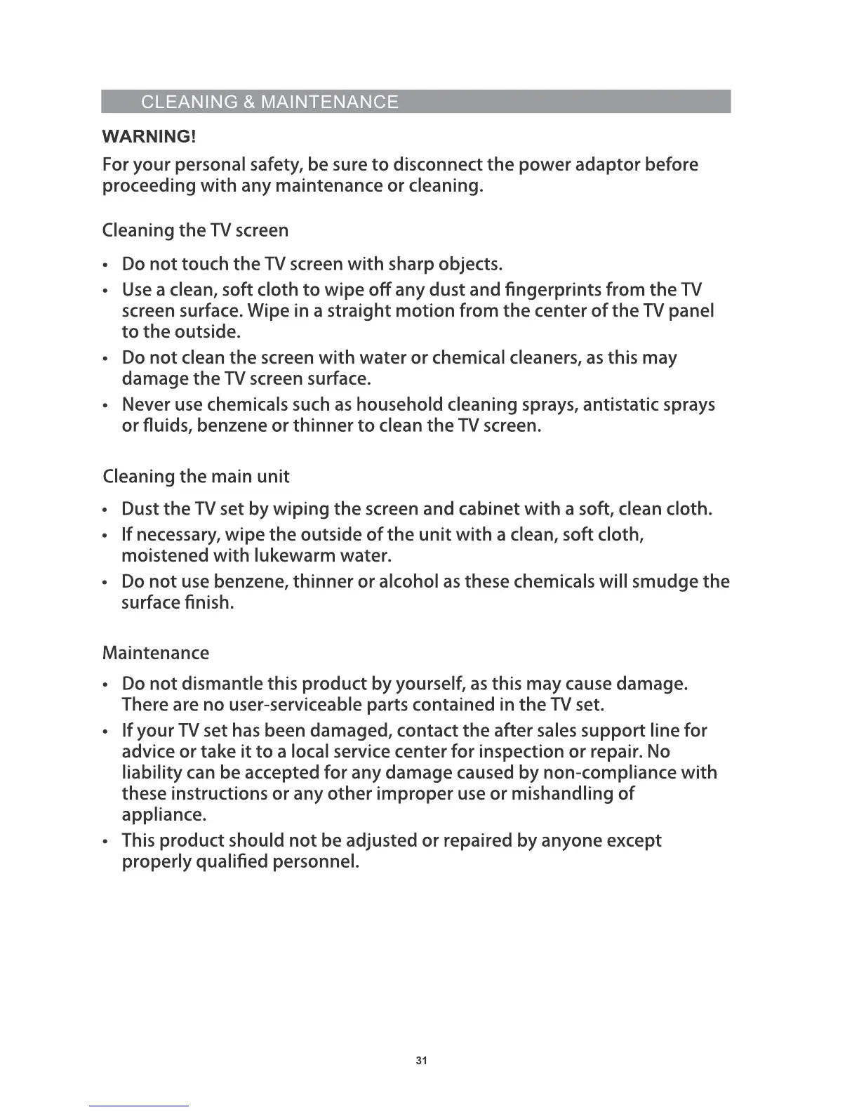 Camec RV Media Evolution 044477 - Maintenance, Troubleshooting, and Specifications; Cleaning and Maintenance Procedures