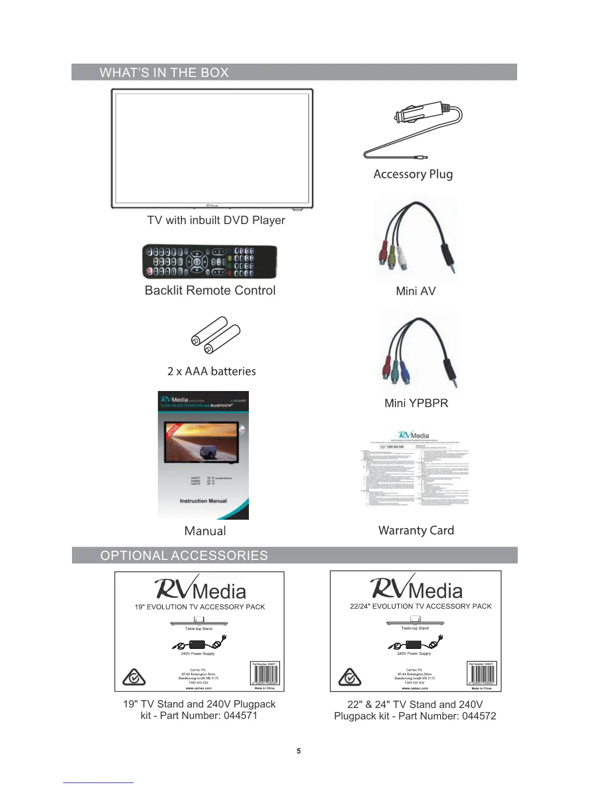 Camec RV Media Evolution 044477 - Whats in the Box and Optional Accessories; Included Components; Optional Accessories