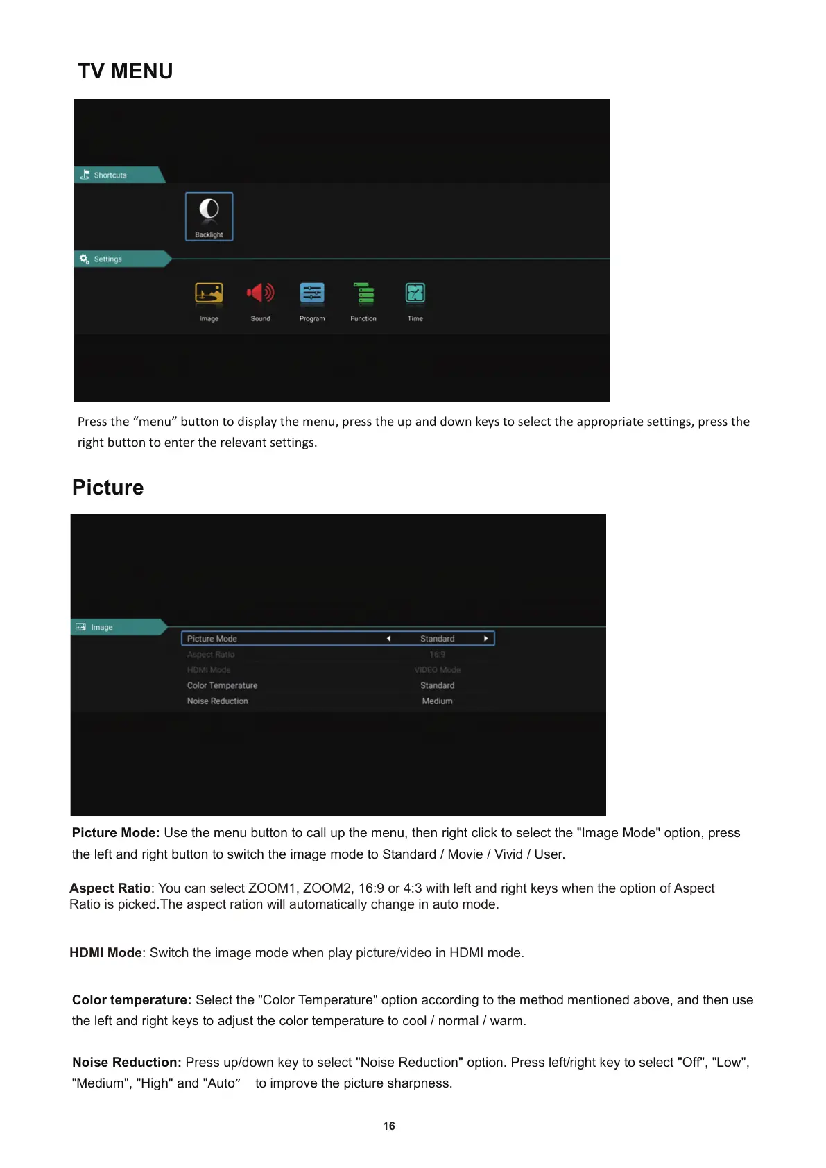 Picture Mode: Use the menu button to call up the menu, then right click to select the "Image Mode" option, press