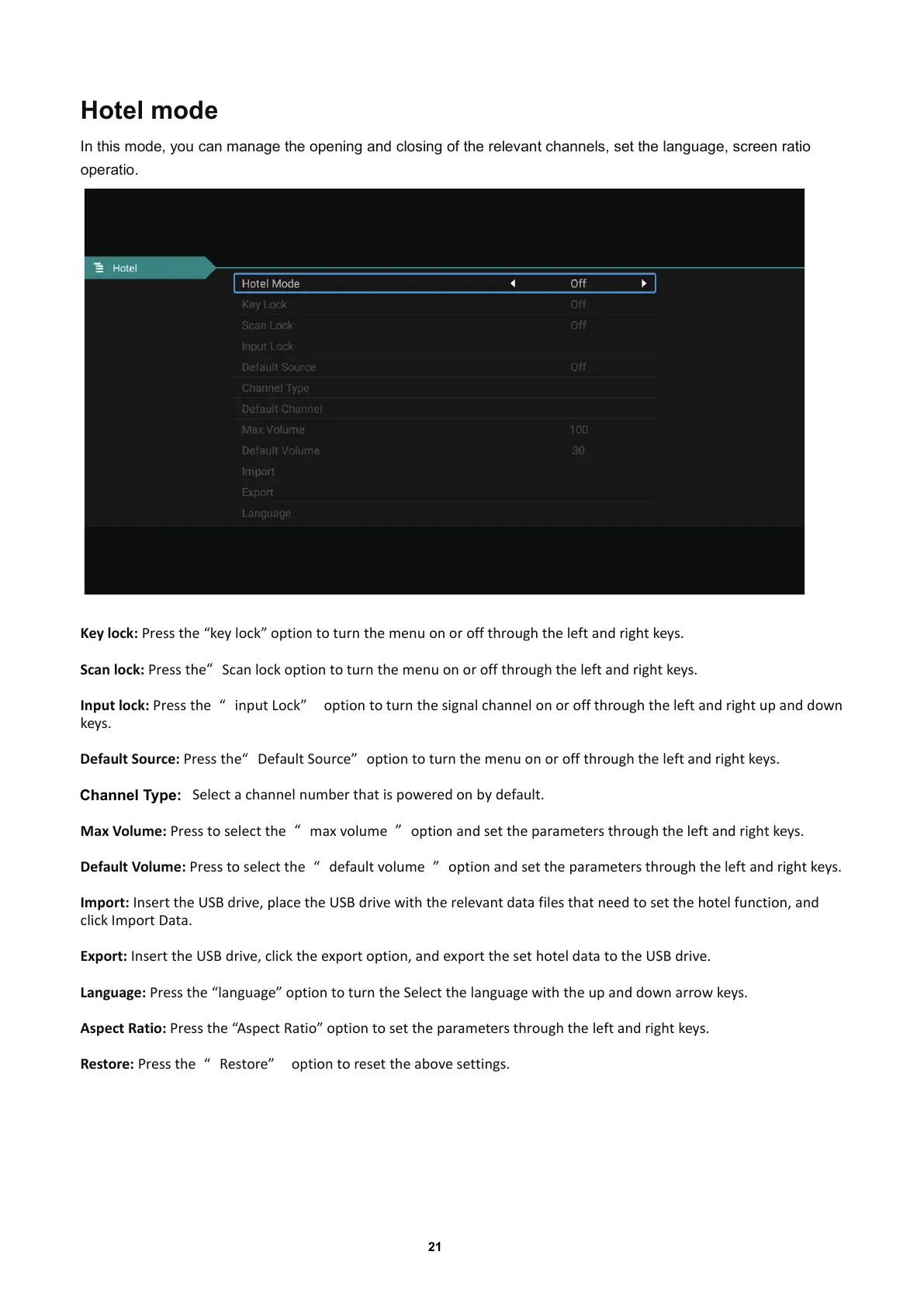 Export: Insert the USB drive, click the export option, and export the set hotel data to the USB drive.