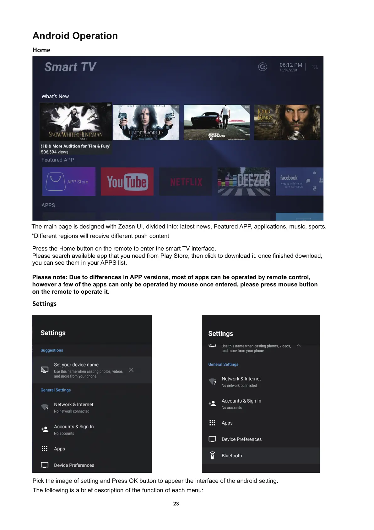 The main page is designed with Zeasn UI, divided into: latest news, Featured APP, applications, music, sports.