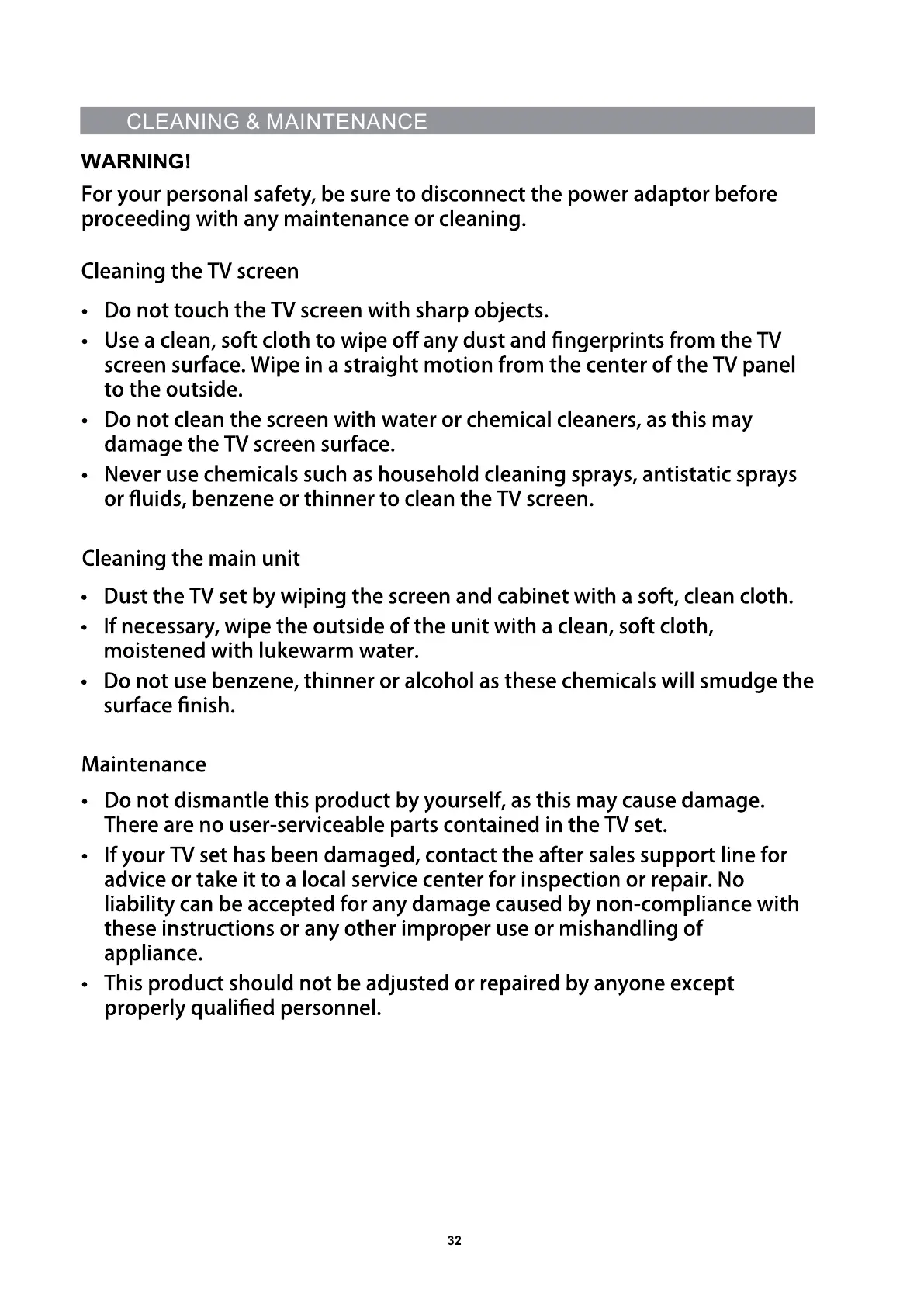 Camec RV Media EVOLUTION - Cleaning and Maintenance; TV Screen Cleaning; Main Unit Cleaning; Product Maintenance and Servicing