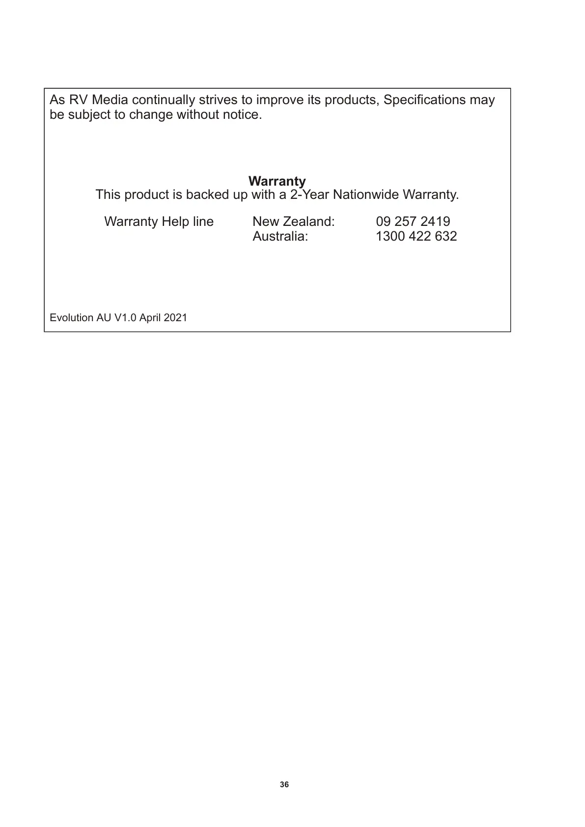 Warranty Help line New Zealand: 09 257 2419