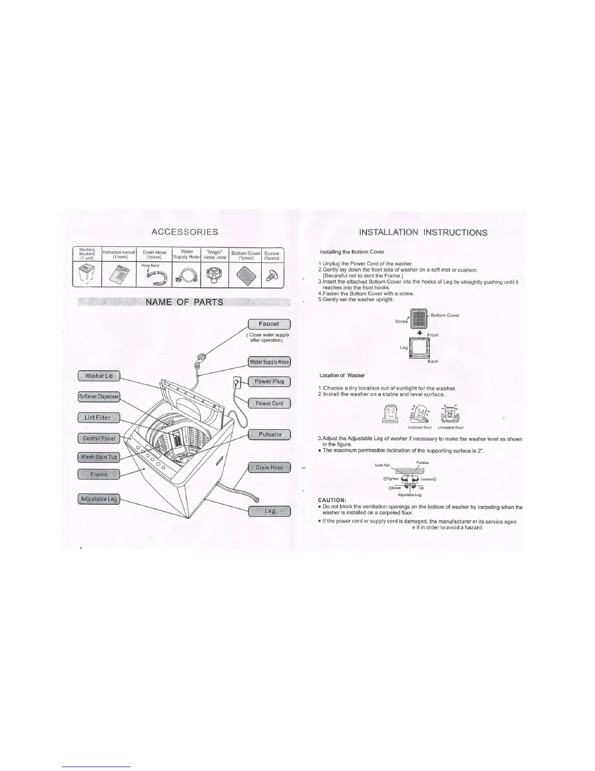 Camel CAWM-60D - ACCESSORIES; Included Items; NAME OF PARTS; Washer Components Identification