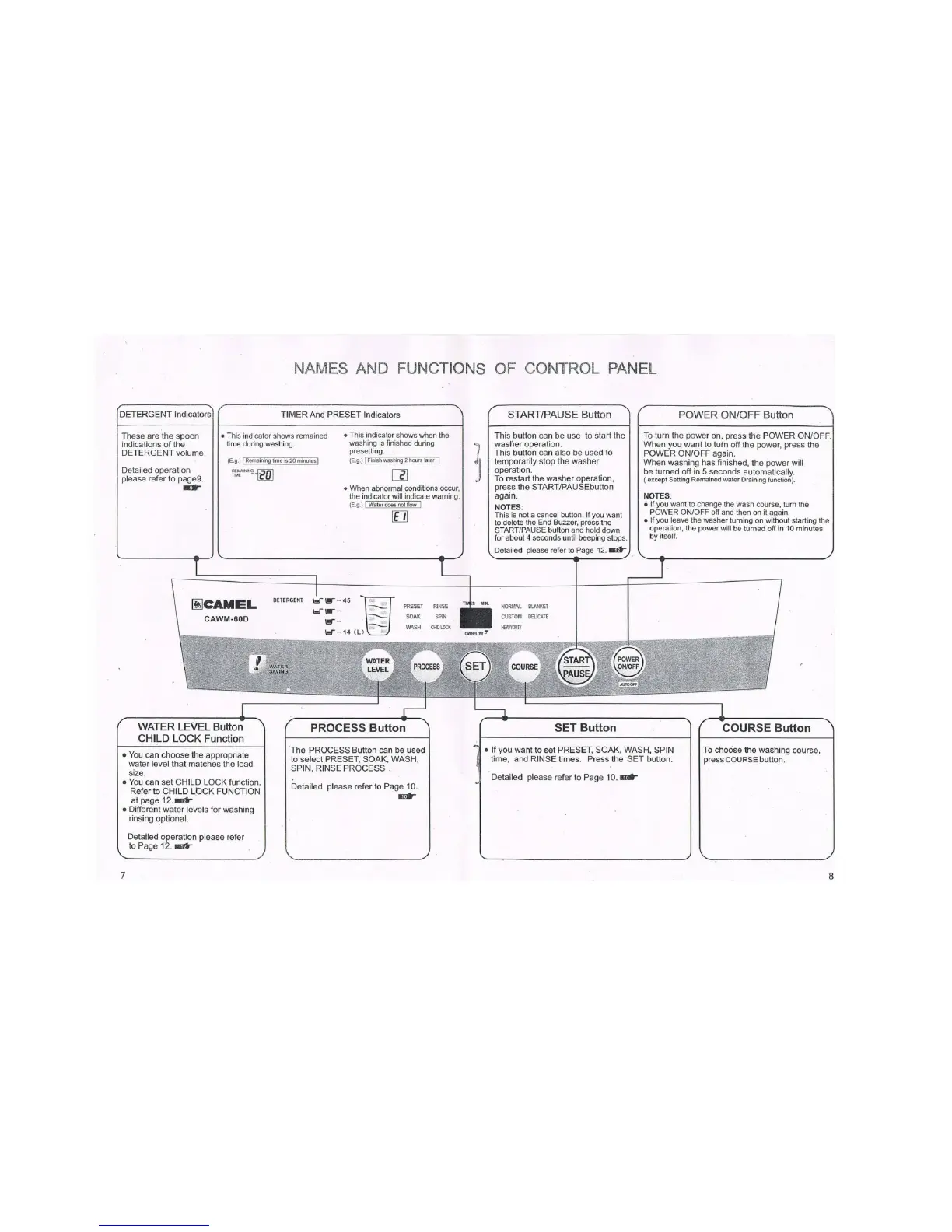 Camel CAWM-60D - Control Panel Functions; Detergent and Timer Indicators; Operation Buttons; Function Selection Buttons