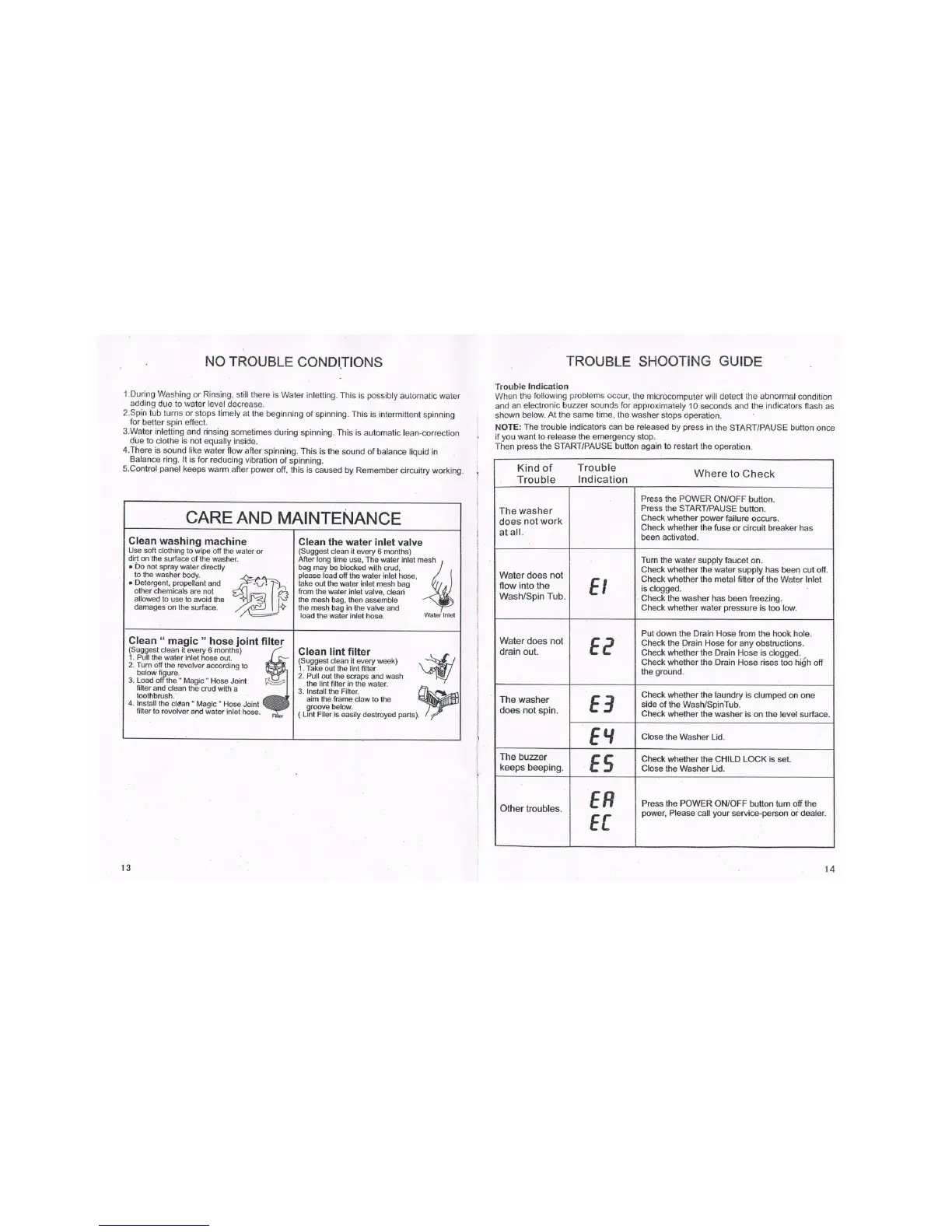 Camel CAWM-60D - NO TROUBLE CONDITIONS; Normal Operational Sounds; CARE AND MAINTENANCE; Cleaning the Washer Body