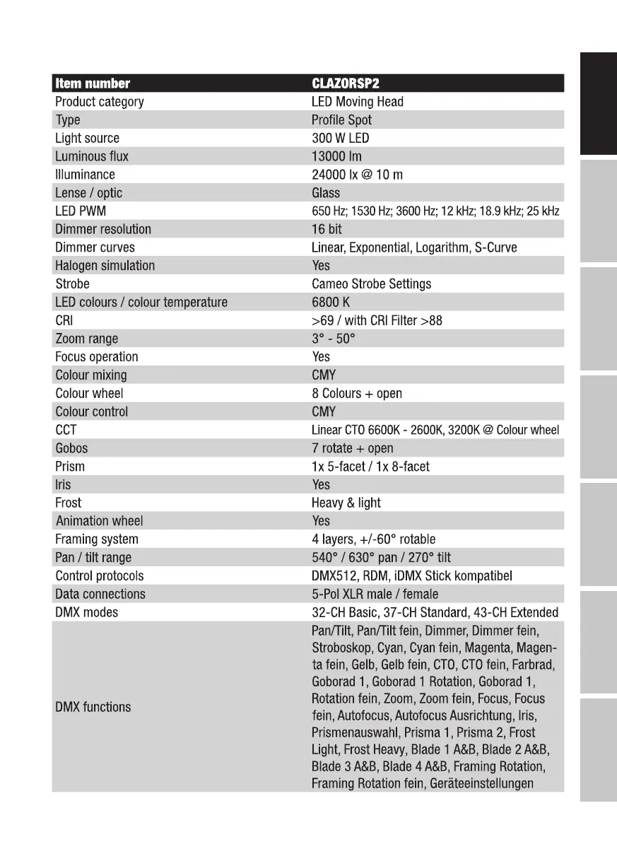 Cameo AZOR SP2 - Technical Data