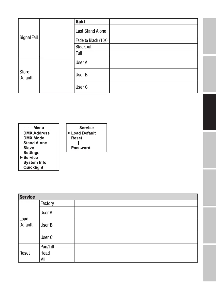 menu Service avec les options correspondantes (sélectionnez avec ⏶ ou ⏷, confirmez avec