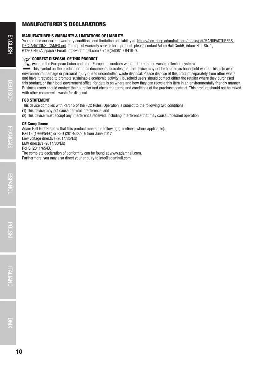 DECLARATIONS_CAMEO.pdf. To request warranty service for a product, please contact Adam Hall GmbH, Adam-Hall-Str. 1,