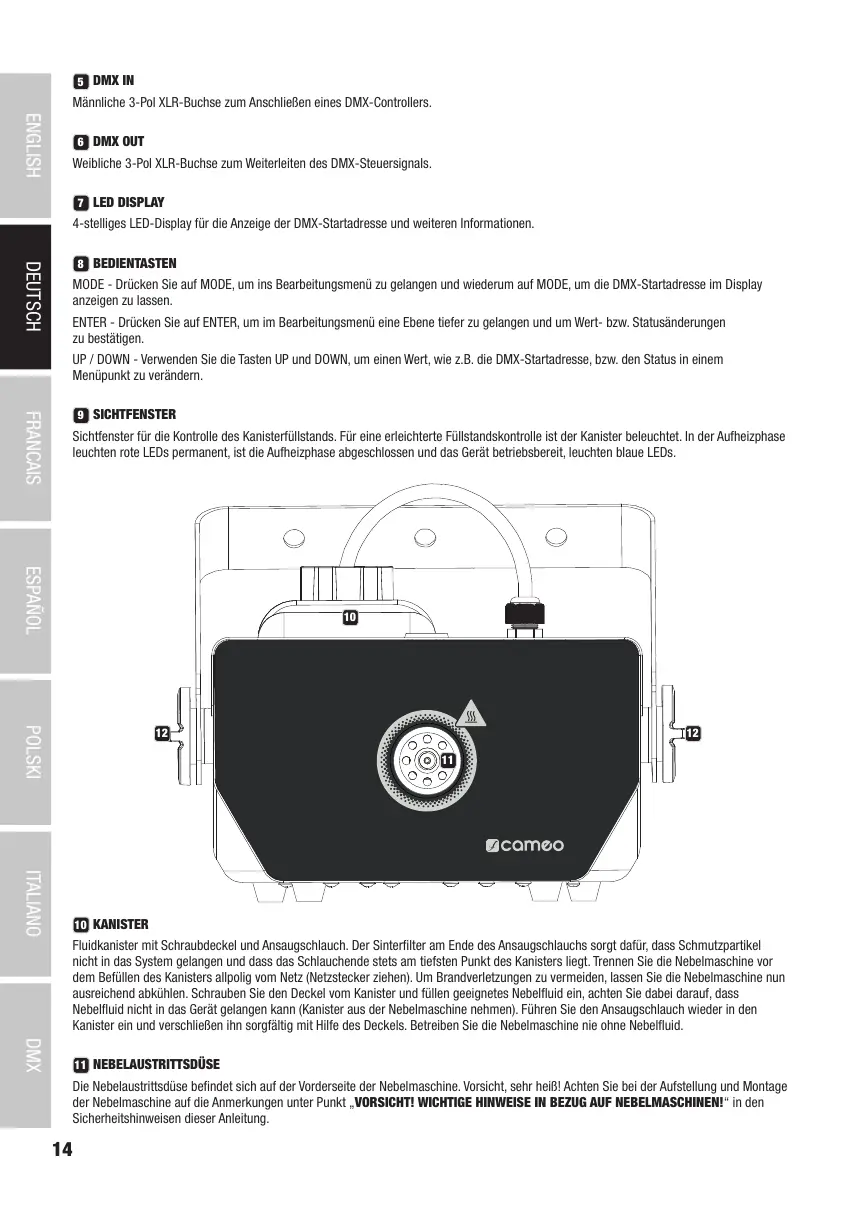 Kanister ein und verschließen ihn sorgfältig mit Hilfe des Deckels. Betreiben Sie die Nebelmaschine nie ohne Nebelfluid.