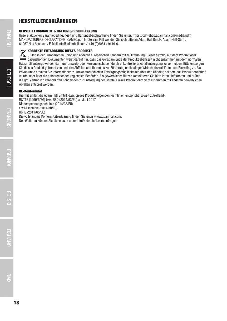 MANUFACTURERS-DECLARATIONS_CAMEO.pdf. Im Service Fall wenden Sie sich bitte an Adam Hall GmbH, Adam-Hall-Str. 1,