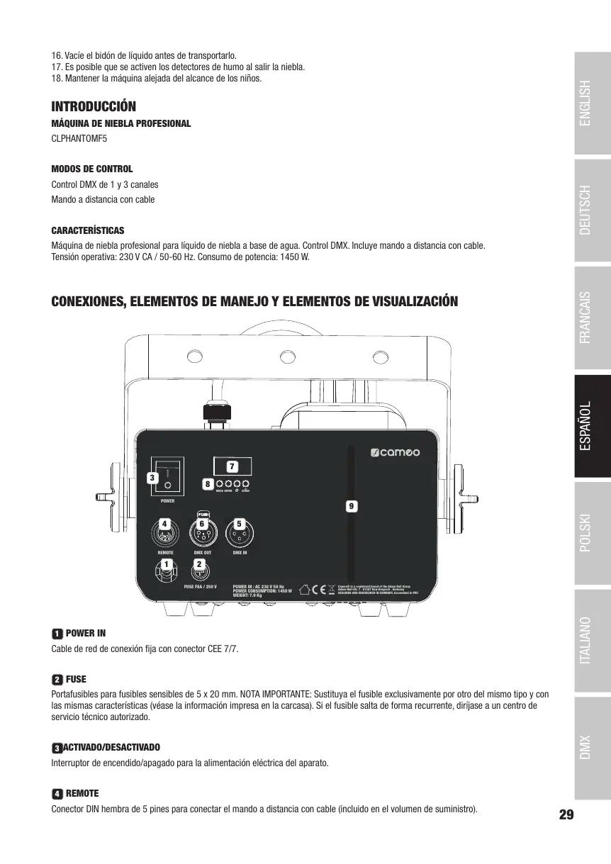 Máquina de niebla profesional para líquido de niebla a base de agua. Control DMX. Incluye mando a distancia con cable.