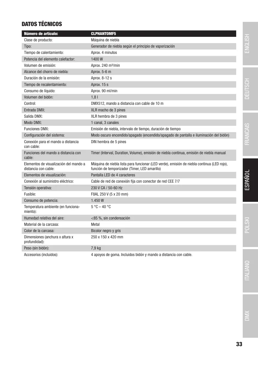 Timer (Interval, Duration, Volume), emisión de niebla continua, emisión de niebla manual