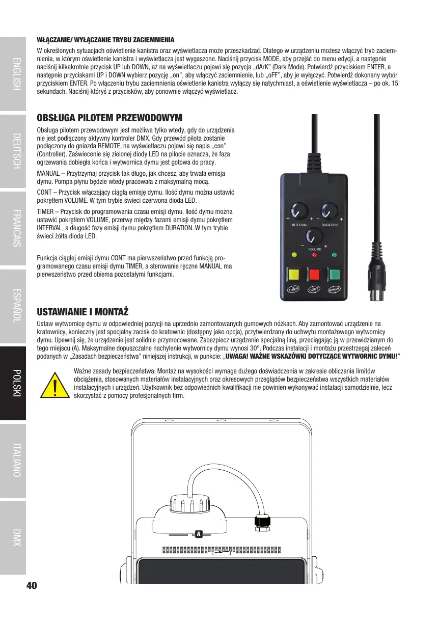 podanych w „Zasadach bezpieczeństwa” niniejszej instrukcji, w punkcie: „UWAGA! WAŻNE WSKAZÓWKI DOTYCZĄCE WYTWORNIC DYMU!”