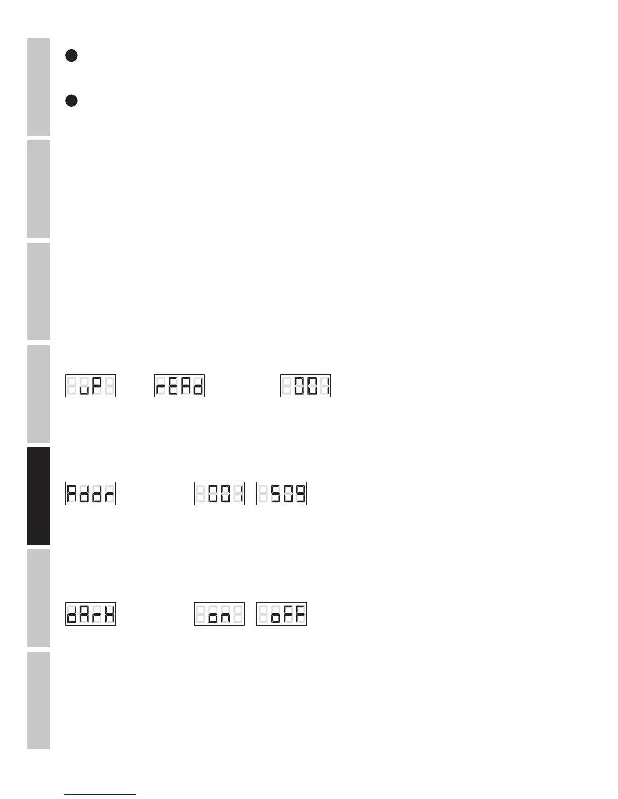 sterowania – symbol „rEAd” (sterowanie za pomocą przewodowego pilota) lub aktualnie ustawiony adres startowy DMX (sterowanie DMX).