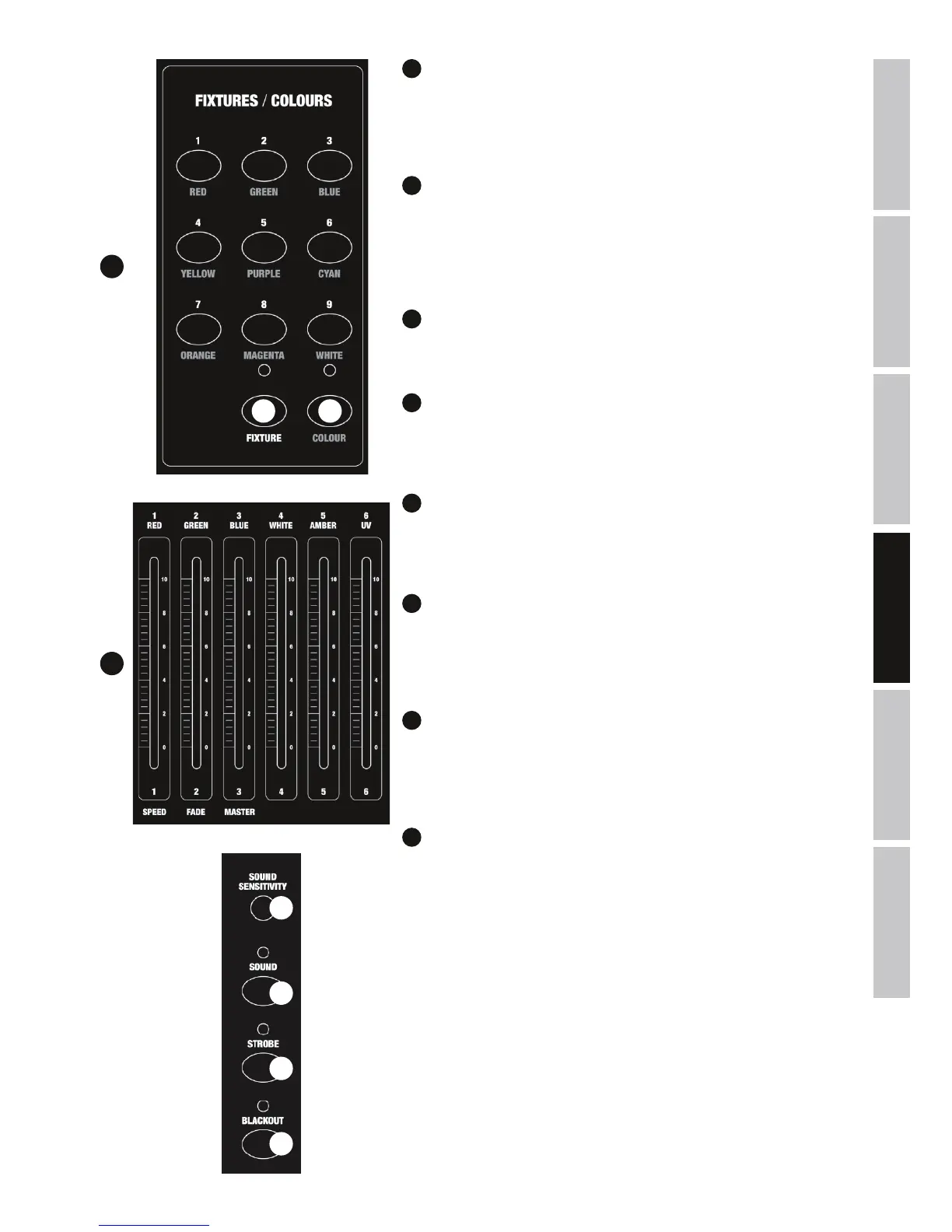Faders de canal, del 1 al 6, que permiten controlar los modos COLOUR FADE, CO-